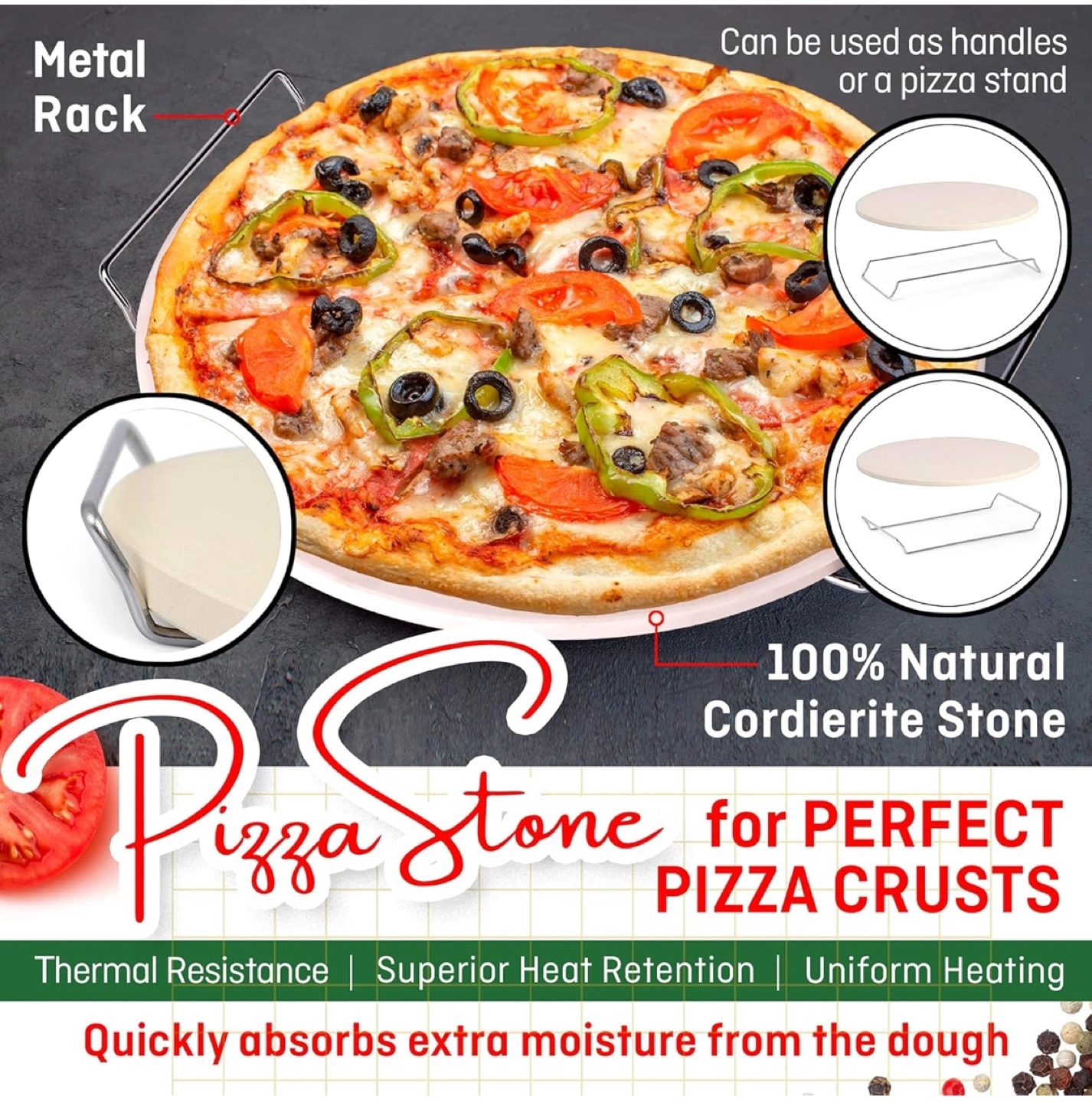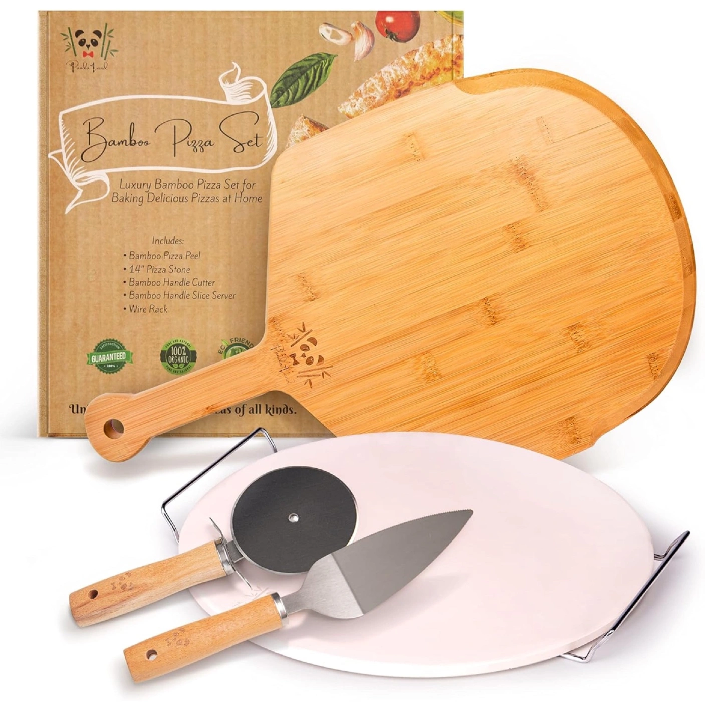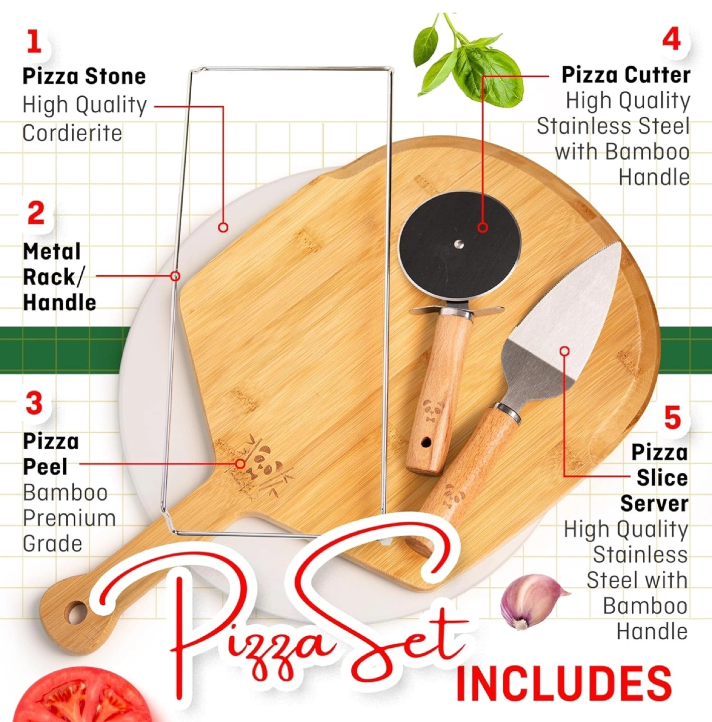 106Complete pizza making set. Includes bamboo pizza peel, cutter, server, 14" cordierite stone, and metal rack. Perfect for home pizza baking.