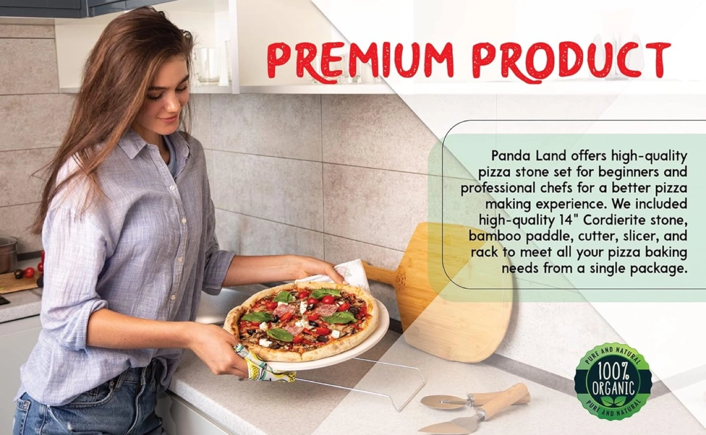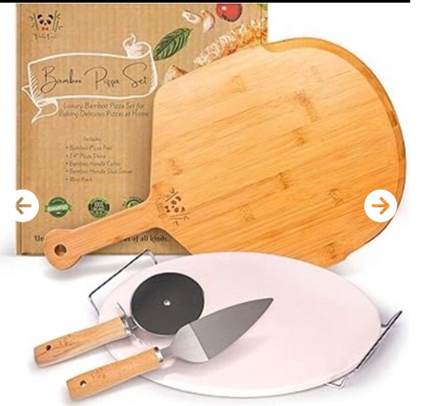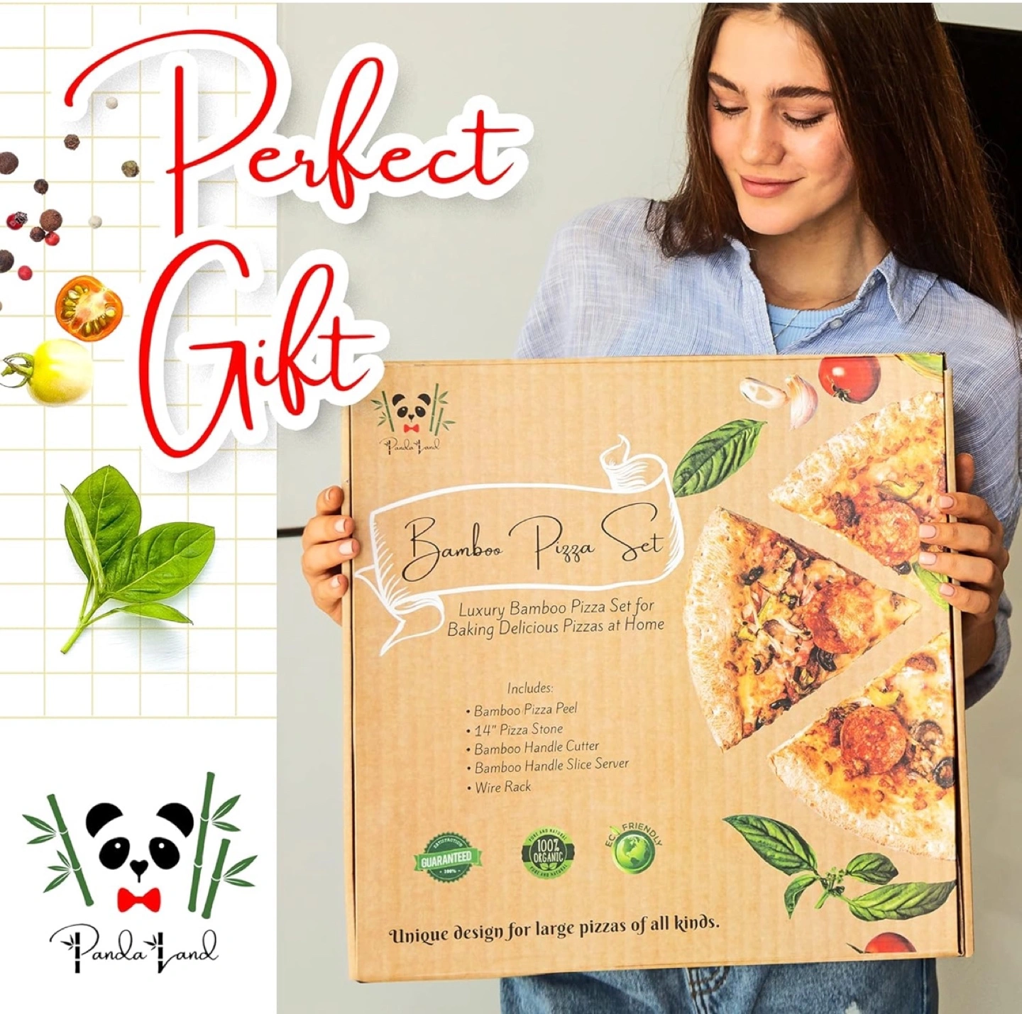 106Complete pizza making set. Includes bamboo pizza peel, cutter, server, 14" cordierite stone, and metal rack. Perfect for home pizza baking.