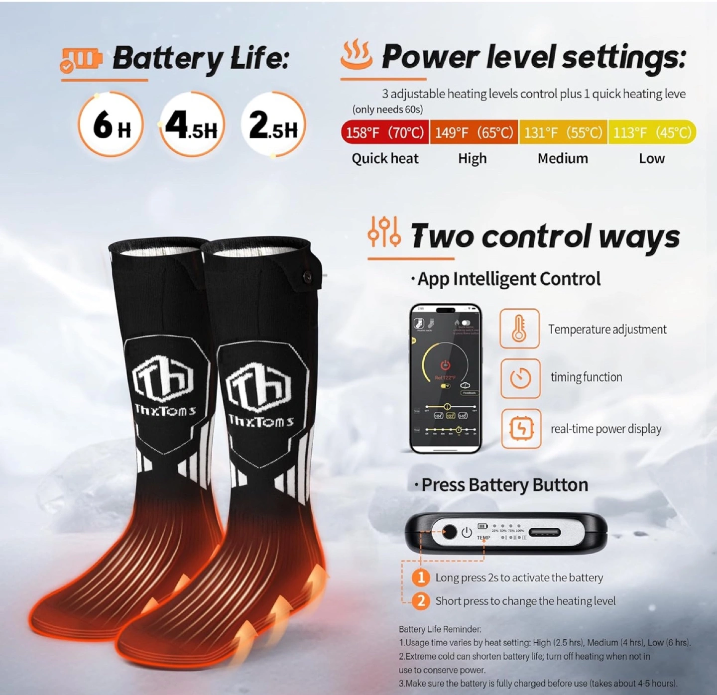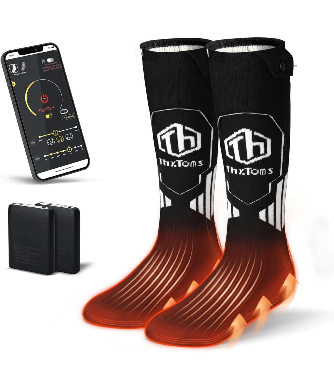 106Electric heated socks. Three adjustable heating levels. App-controlled or button-operated. Includes rechargeable battery packs. Long battery life.