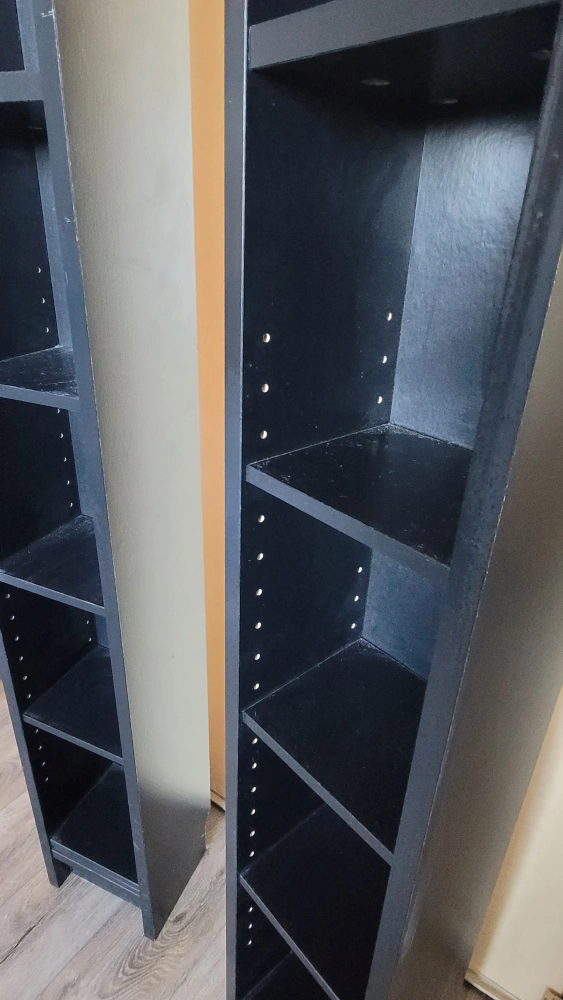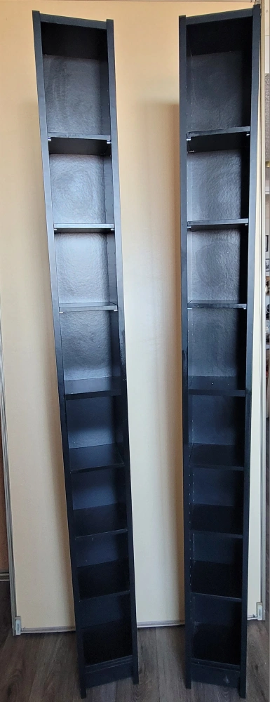 Selling as a pair. Sizing is 202 x 20 x 17cm and in a black finish. Both have 8 adjustable shelves (with 2 extra each, you just need to grab some extra shelf pins from IKEA).