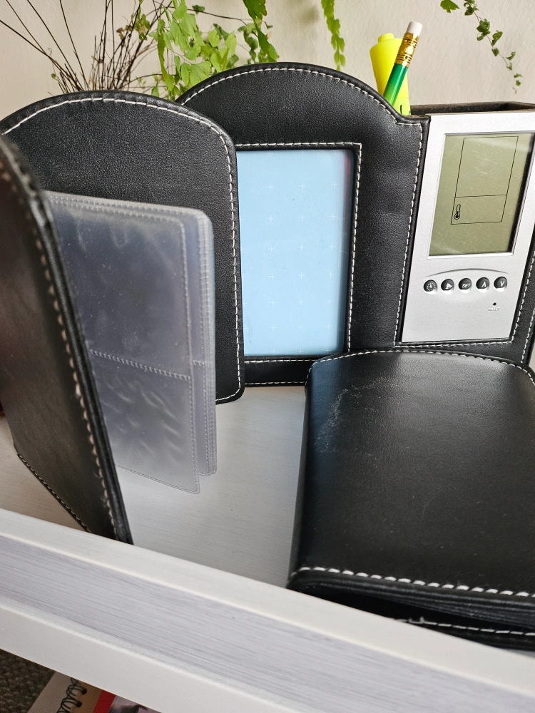 355Black leather desk organiser. Features a small photo frame, digital clock and multiple card slots. Great for organising your workspace.