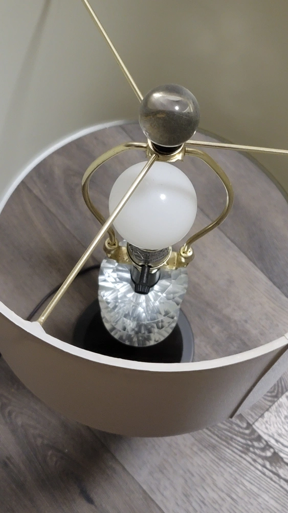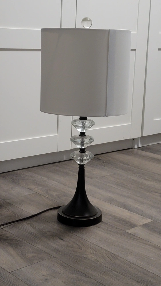 Purchased at Homesense a few years ago, this black table lamp is good quality, and has nice "crystal" accents. Finish is a bit antique with the black more like a dark bronze.