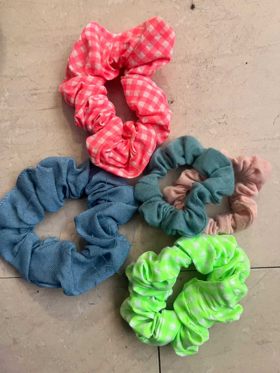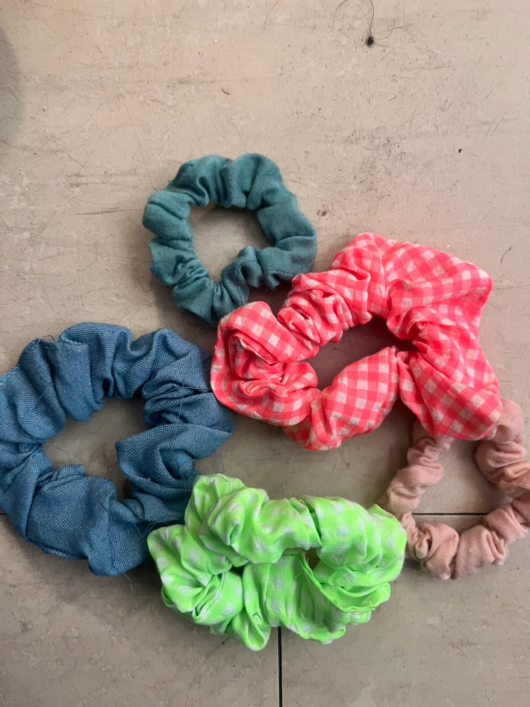 217Set of five fabric scrunchies. Various colours and patterns. Great for styling hair.