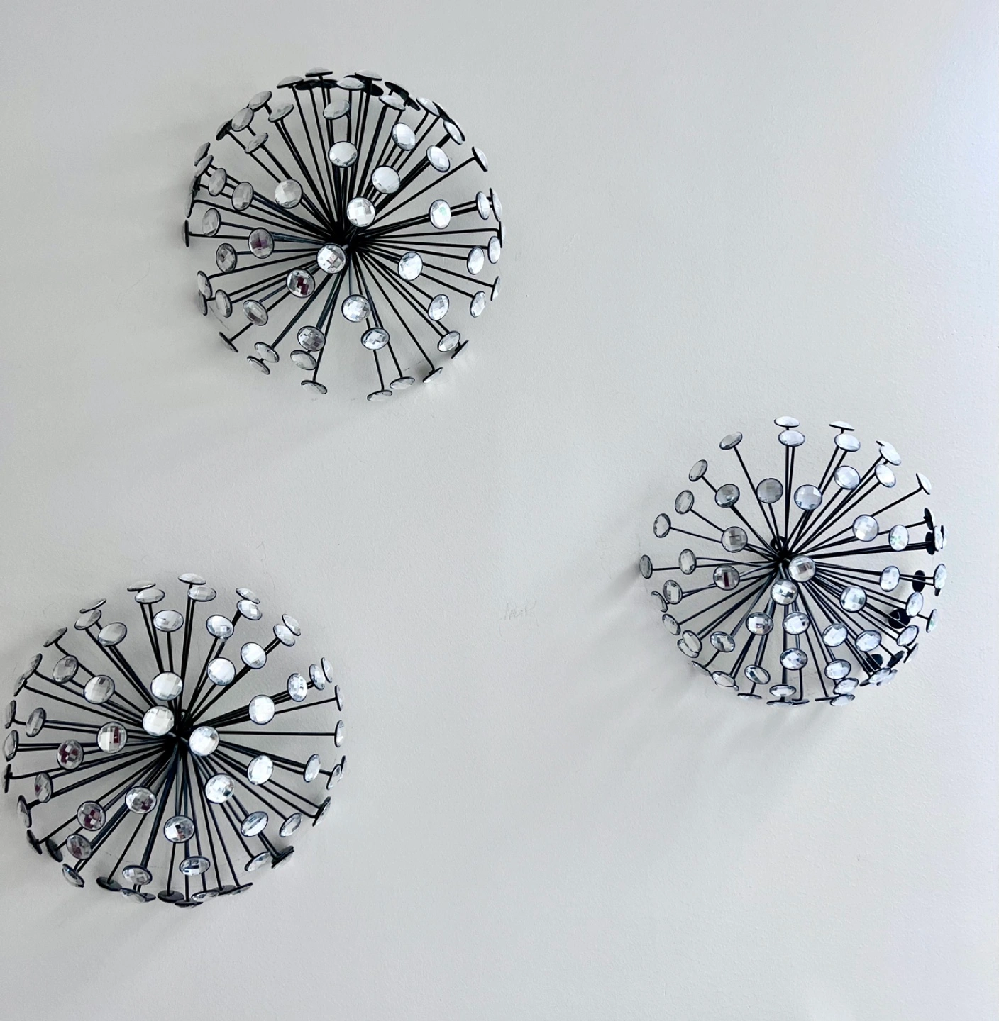 Three decorative wall hangings. Metal starburst wall decor. Modern design. Excellent condition. Cash only.