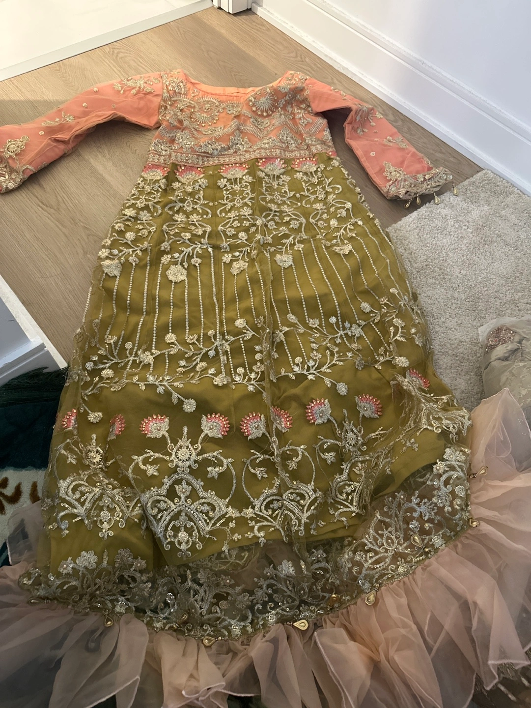 Gorgeous olive green and peach coloured Pakistani shalwar kameez. Intricate embroidery and embellishments. Long sleeves, floor length. Perfect for special occasions.