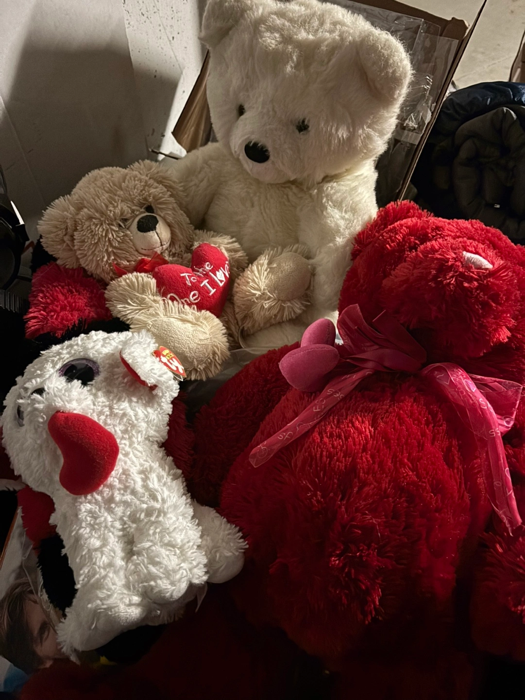 Four plush toys, ideal for Valentine's Day. Includes a large white bear, a smaller beige bear holding a heart, a red bear with a pink ribbon, and a small white dog. Great for collectors or gift-giving.