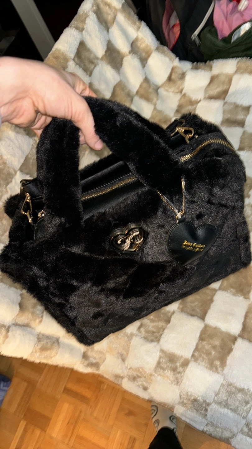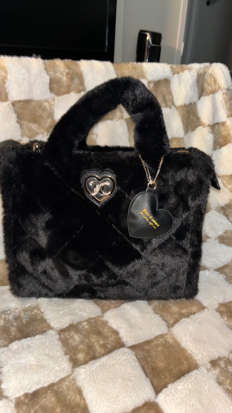 Adorable black handbag. Features soft fluffy exterior, quilted design, and signature Juicy Couture heart emblem. Top handles and a detachable shoulder strap. Perfect for a night out or everyday use.