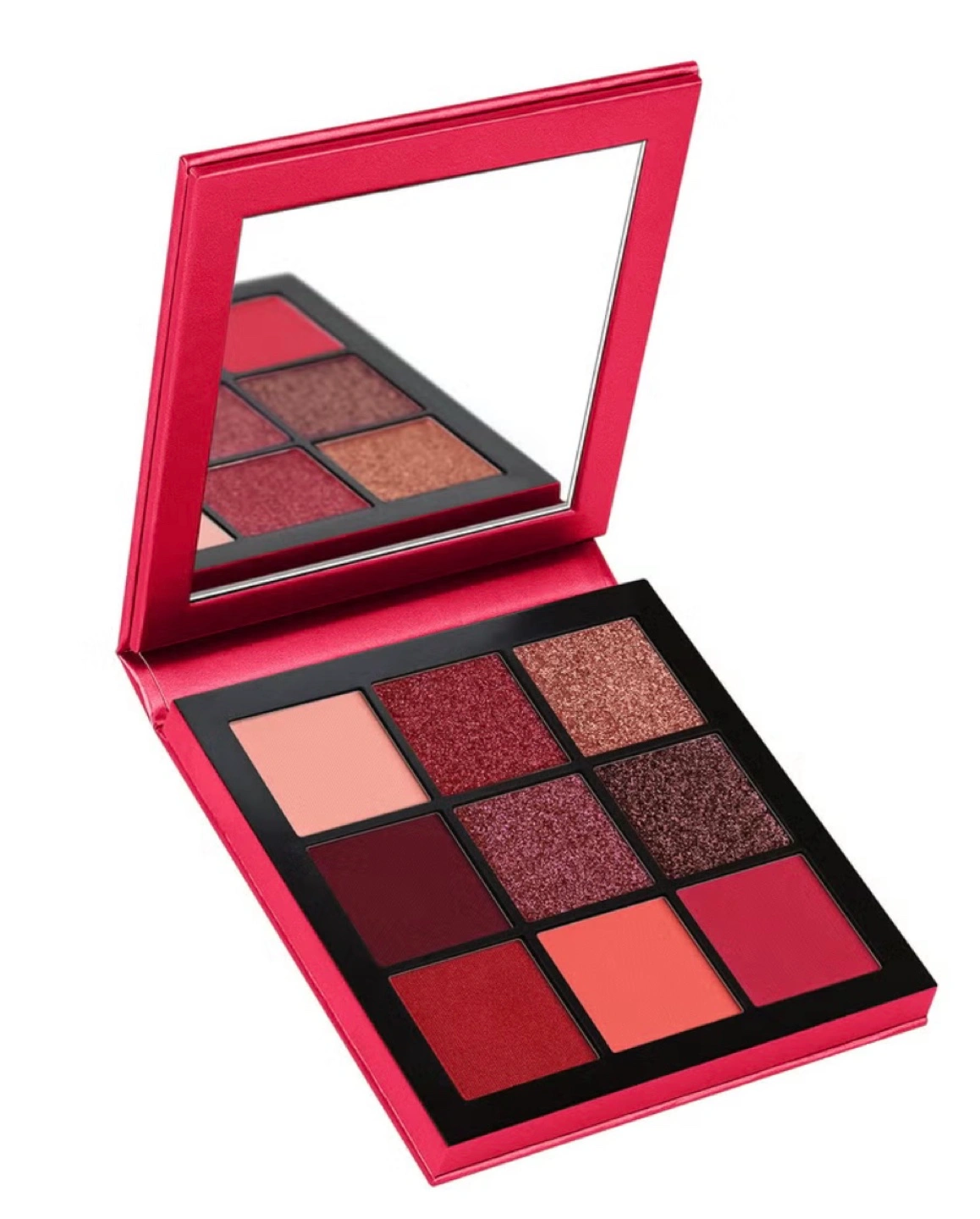 Nine-pan eyeshadow palette. Red and pink shades. Compact mirror included. New or gently used.
