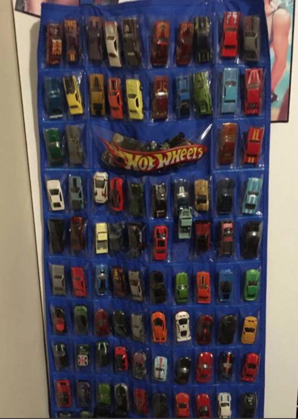 Large blue wall case filled with various Hot Wheels cars. Great for collectors or enthusiasts. Many different models and colours. 120 pcs. of 1:64 scale car models.