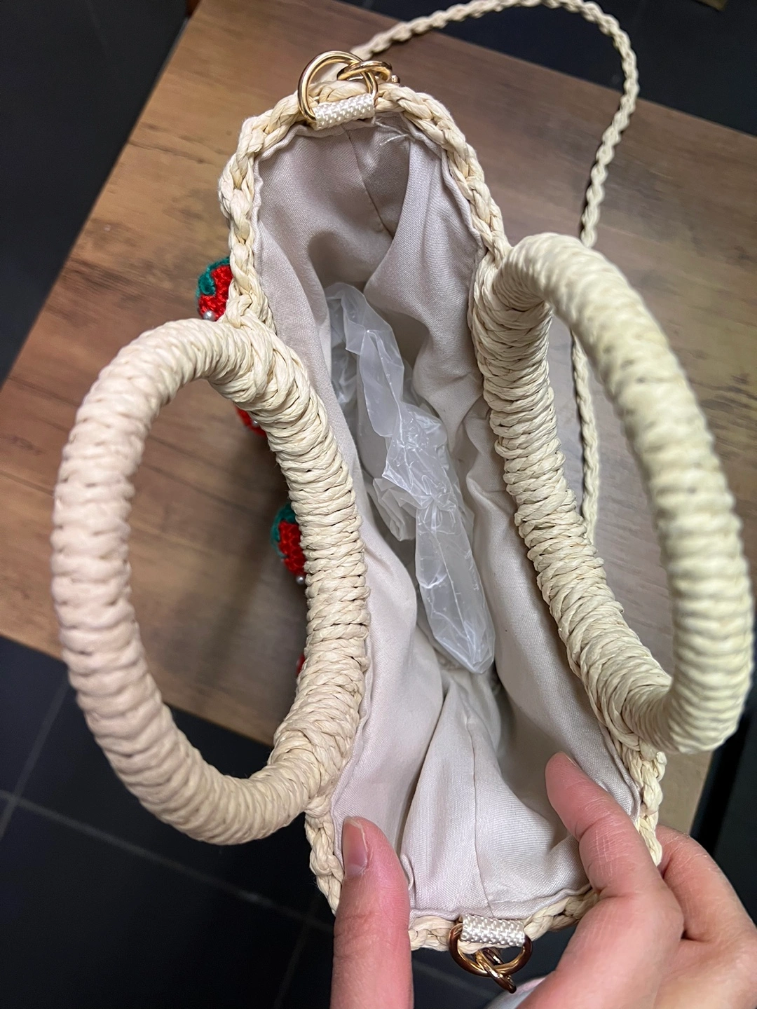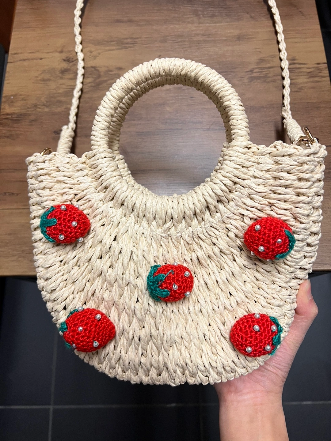 Handwoven bag with crochet strawberries! The inside is lined with cloth as well. In brand new/perfect condition, never used! Super cute, just trying to clean out my closet🥲