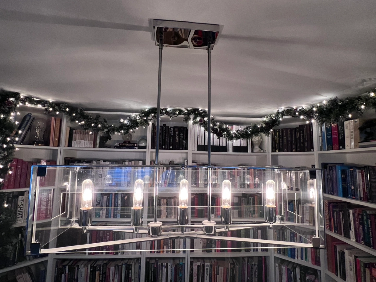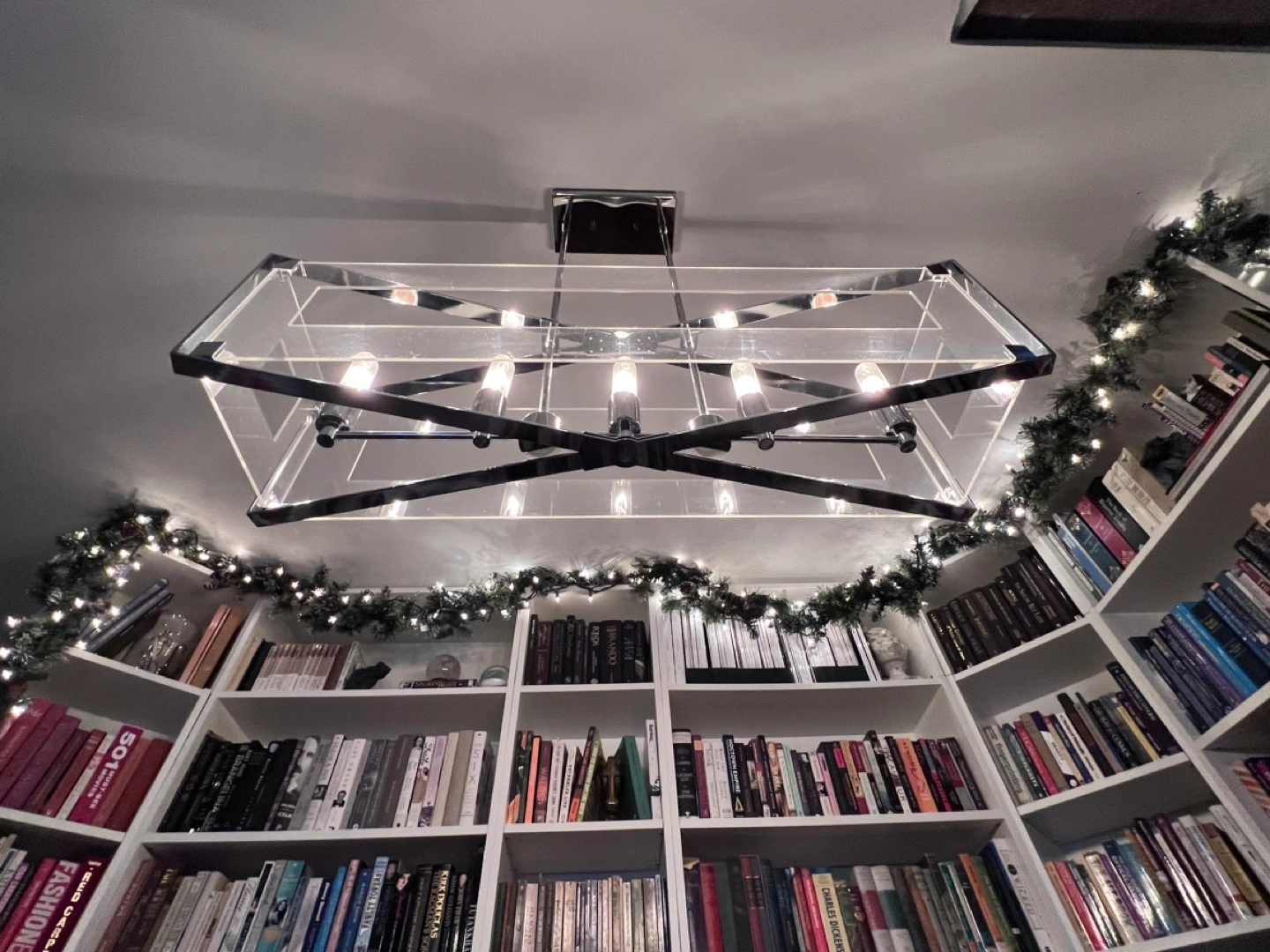 Sleek rectangular light fixture. Five lights. Clear acrylic frame. Chrome accents. Minimalist design. Bought at Dominion Lighting for $700