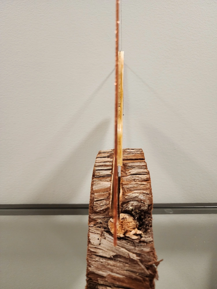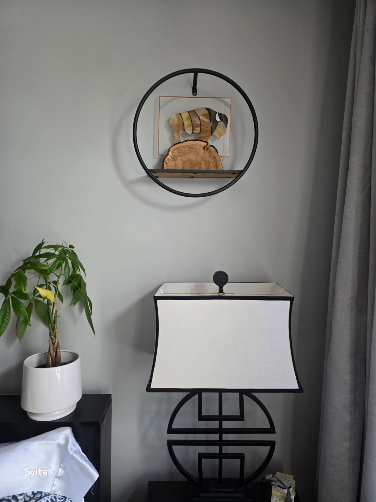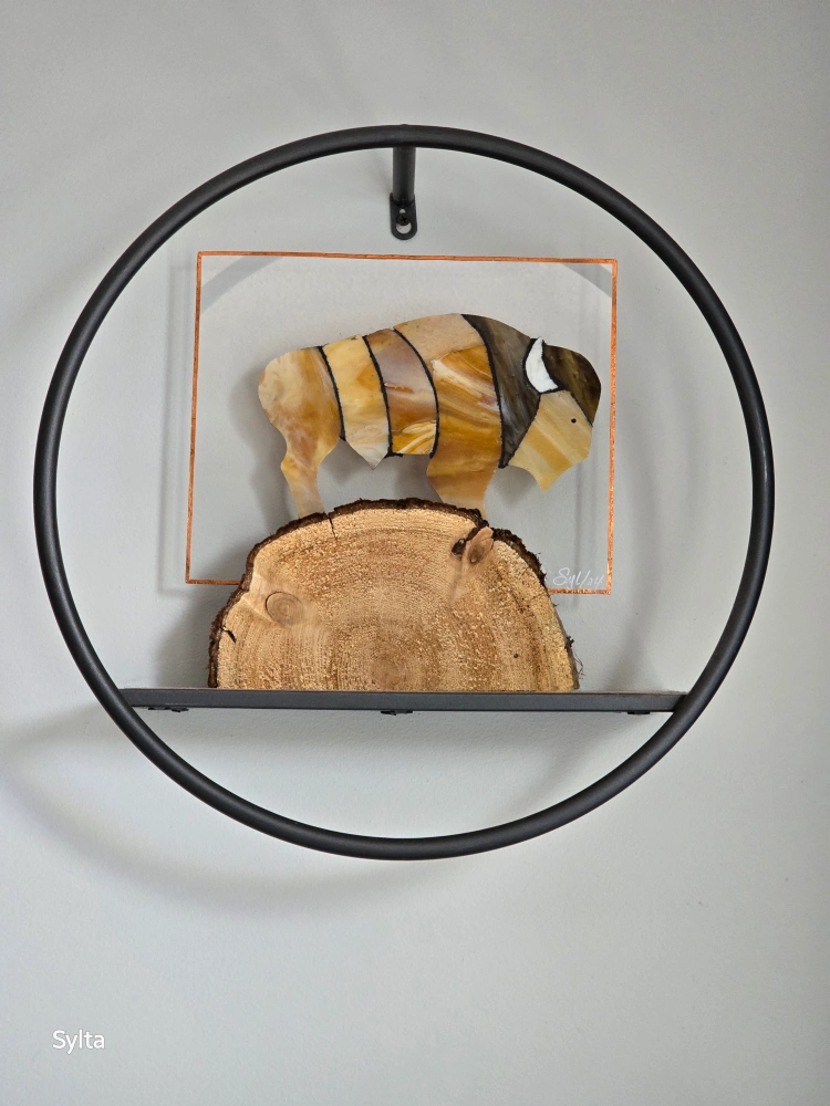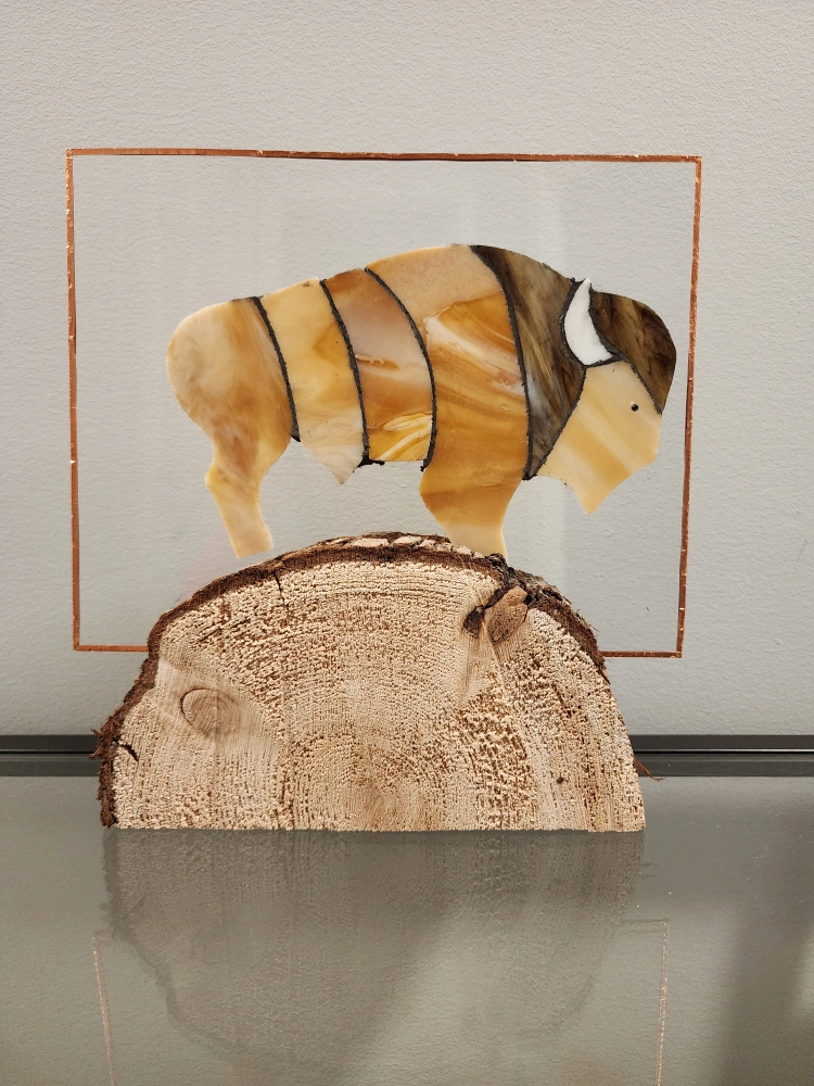 Handcrafted glass on glass by a local artisan. Features a stained glass bison on a wood slice. Copper frame. Beautiful addition to any home decor.