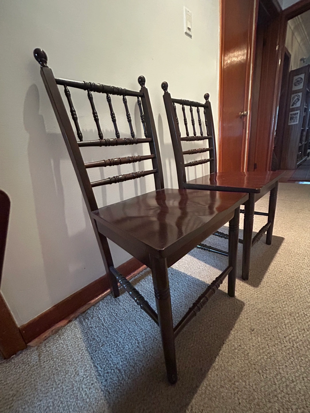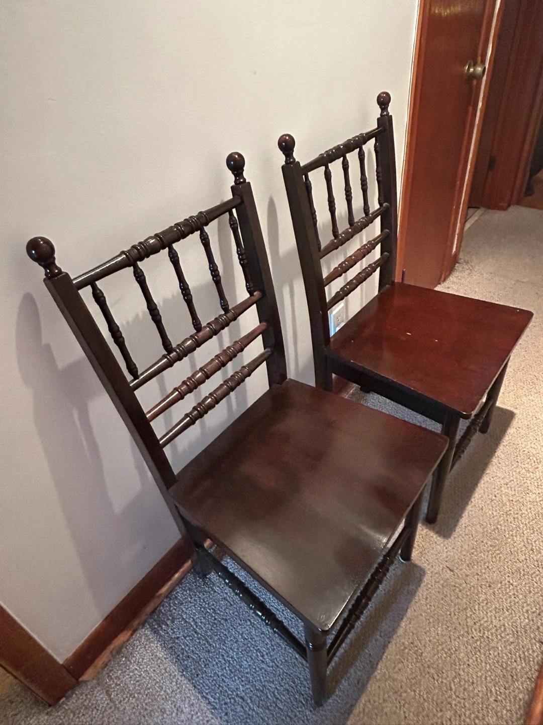 Two matching dark brown wooden dining chairs. Simple design, turned spindles on back and legs. Solid wood construction. Good condition.