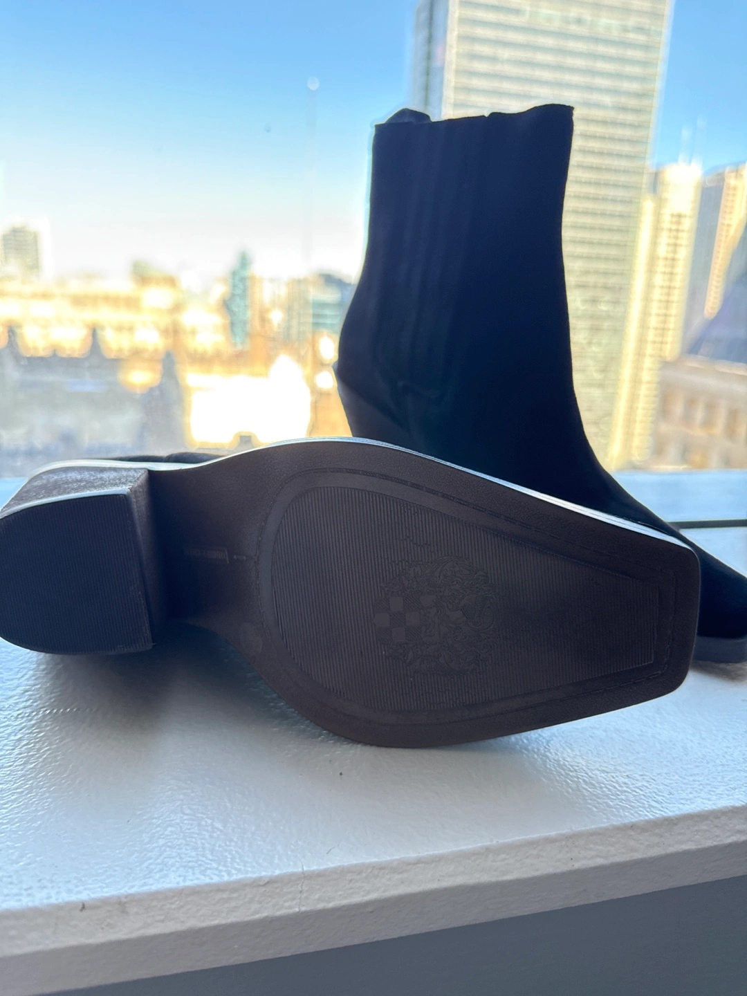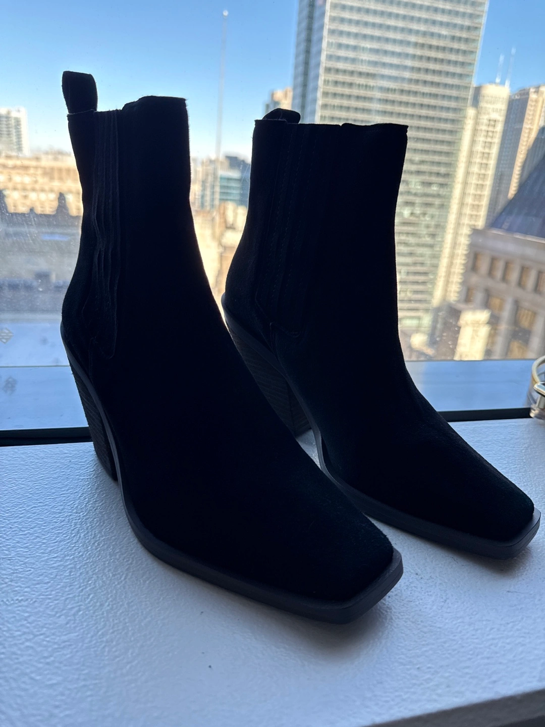 Pair of black suede ankle boots. Western style. Square toe. Low block heel. Slight pull-on tab. Worn only once.