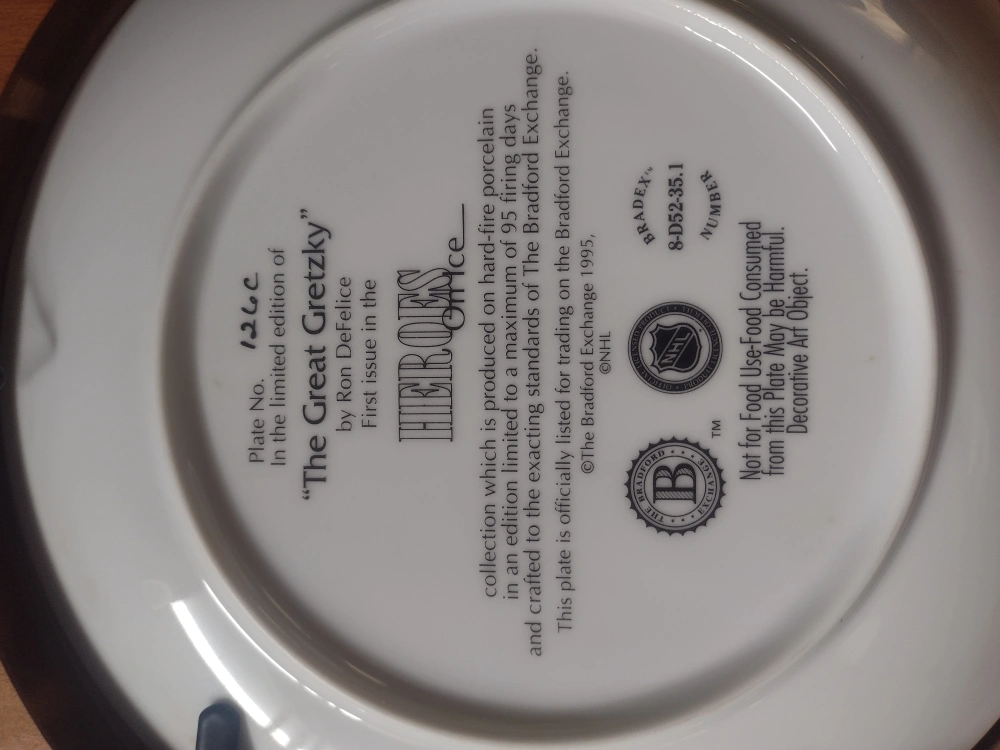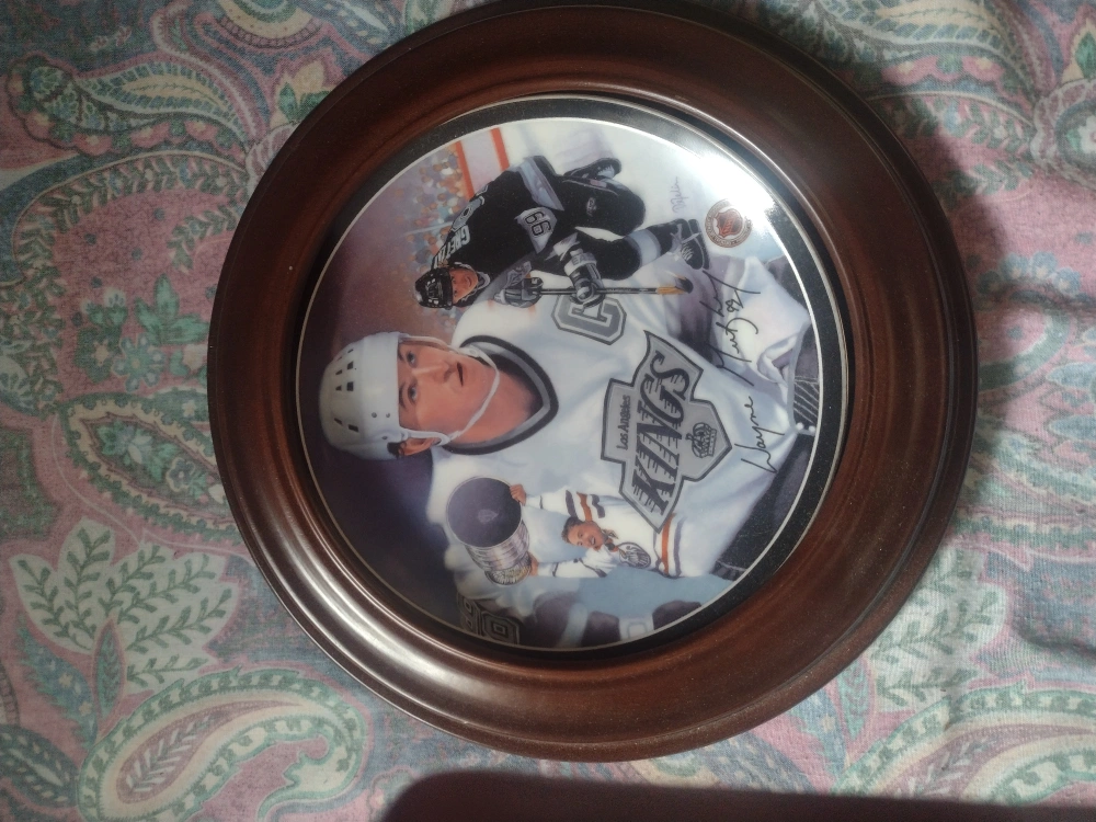 Collectible porcelain plate. 5" Dia, 8" with frame. Features Wayne Gretzky in LA Kings uniform. Part of the Bradford Exchange's "Heroes" series. Limited edition. In a dark wood frame. Plate #126 C.