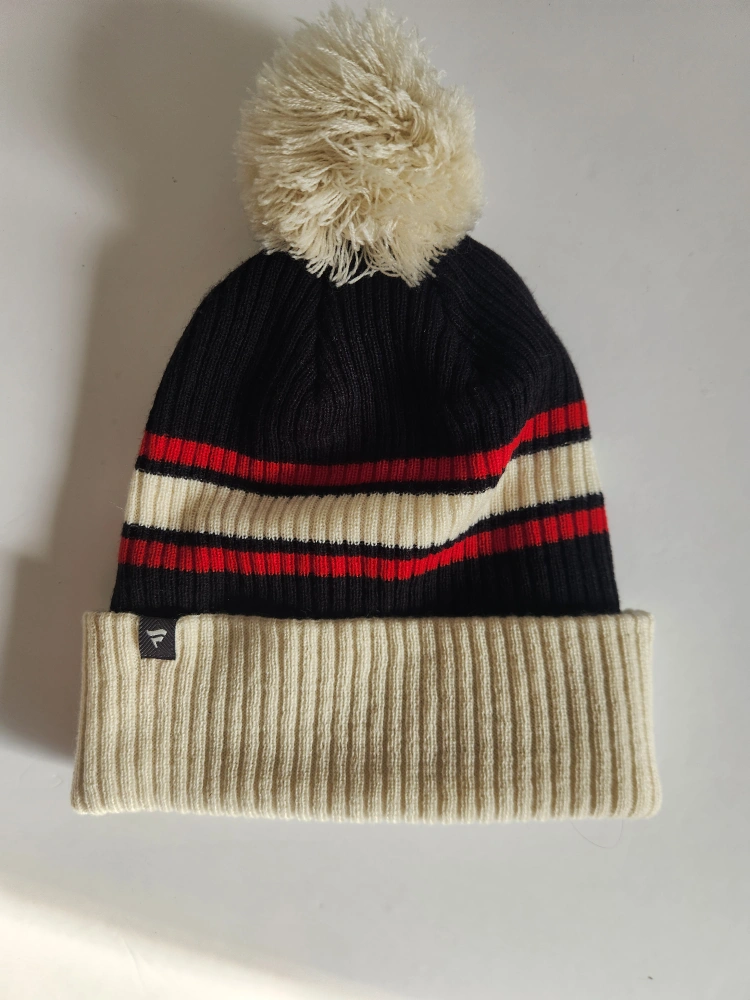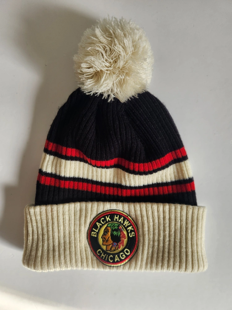 Black and cream knit toque. Features a red and black striped band. Cream coloured pom-pom. Embroidered Blackhawks logo. Great for hockey fans!