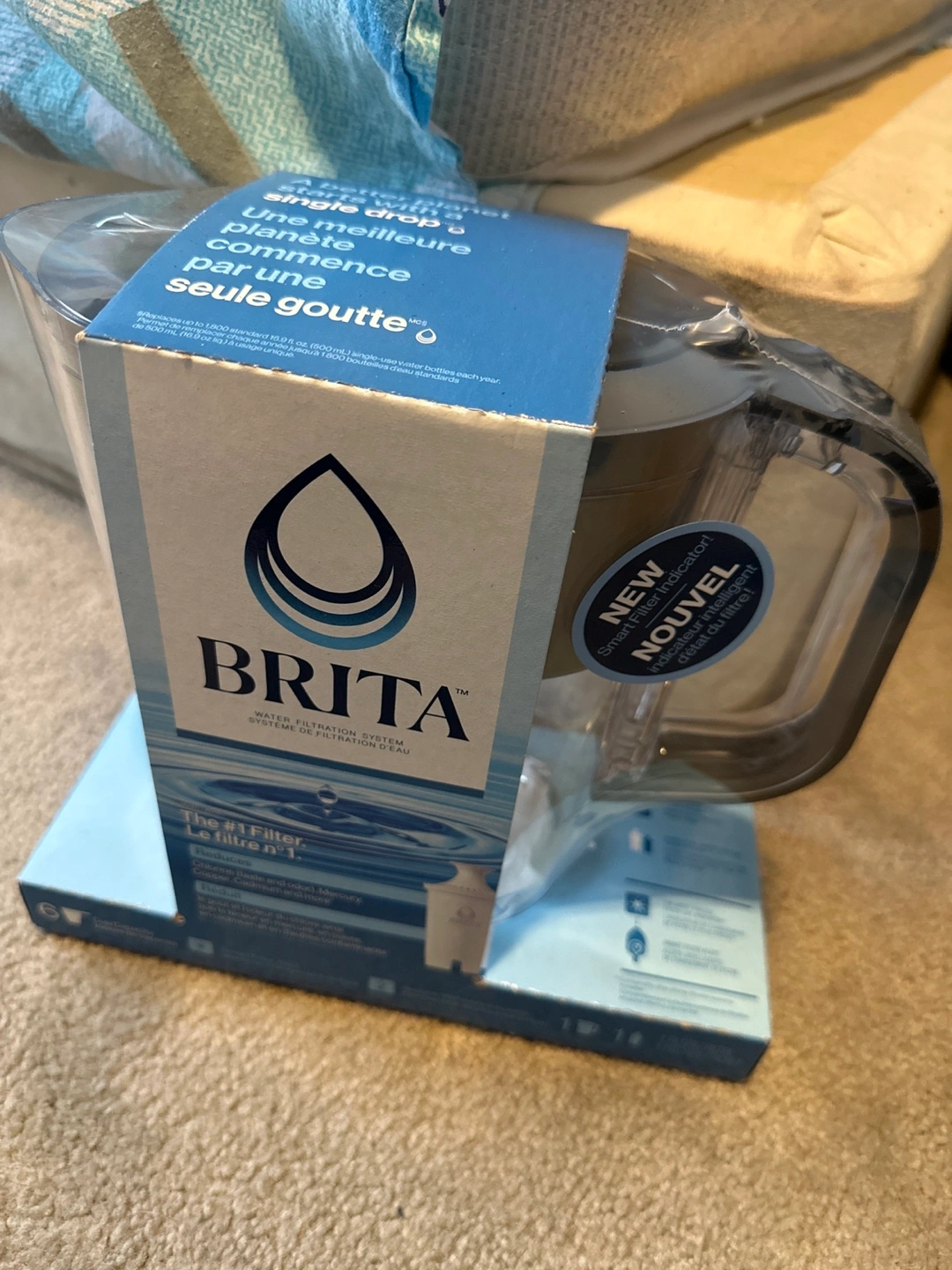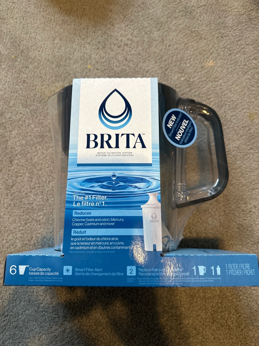 New BRITA water filter pitcher. Includes one filter. Smart filter indicator. Reduces chlorine, mercury, copper, cadmium and more.