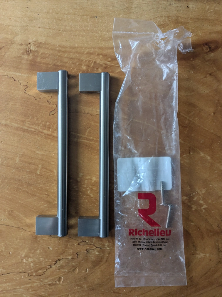 Two brushed nickel cabinet pulls from Richelieu with modern design. In great condition with only minor flaw in the last photo, never used and includes mounting hardware.