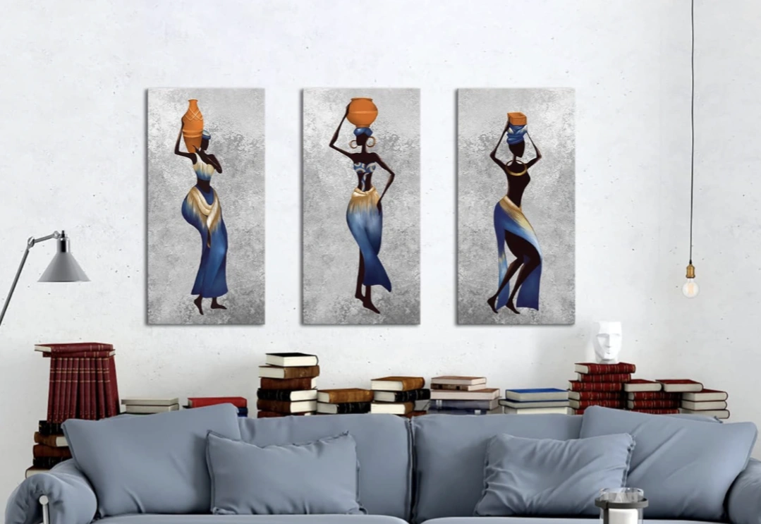 Three-piece canvas print. Features stylized figures of African women. Blue and gold tones. Modern home décor.