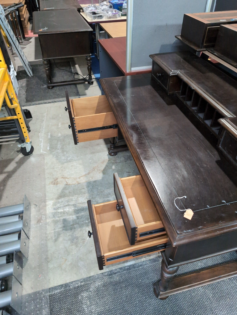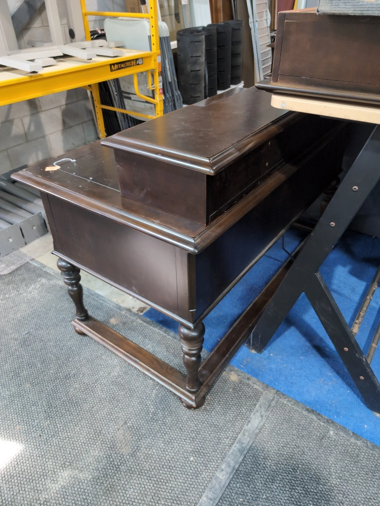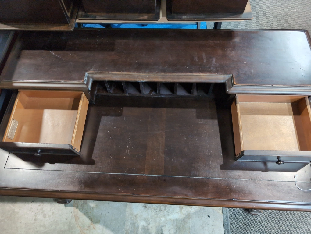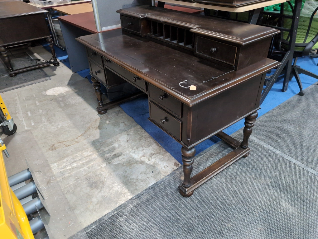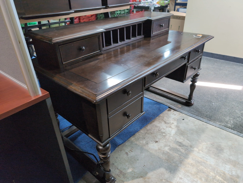 Large desk. Multiple drawers and cubbies. Dark brown finish. Good for home office. Has a Keyboard area. Has Electrical connection capabilities in the back of desk. Measures approximately 58.5" long x 30.5* deep x 31" tall and 37.5" from the floor to the top of the hutch/cubbies. $225 Each plus HST. Pick up near Gage and Belmont in Kitchener Monday-Friday from 12-5 p.m. By appointment. Check out my other ads!