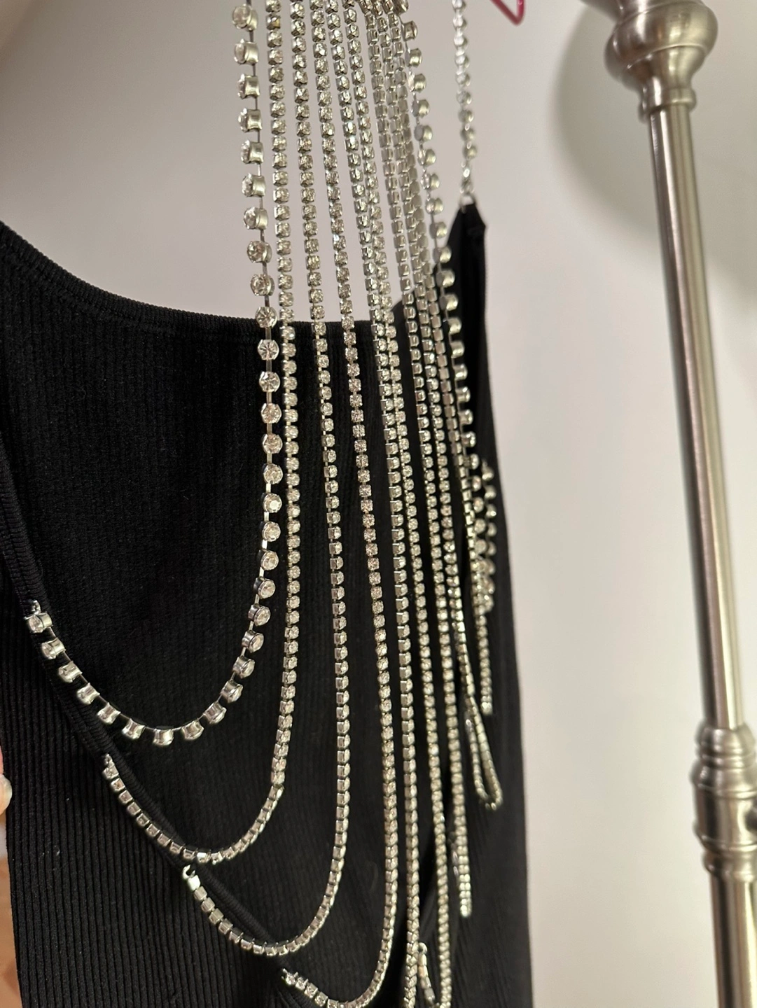 71Black Zara midi back chain dress. Features a stunning rhinestone chain detail across the back and straps. Size XS-S.
