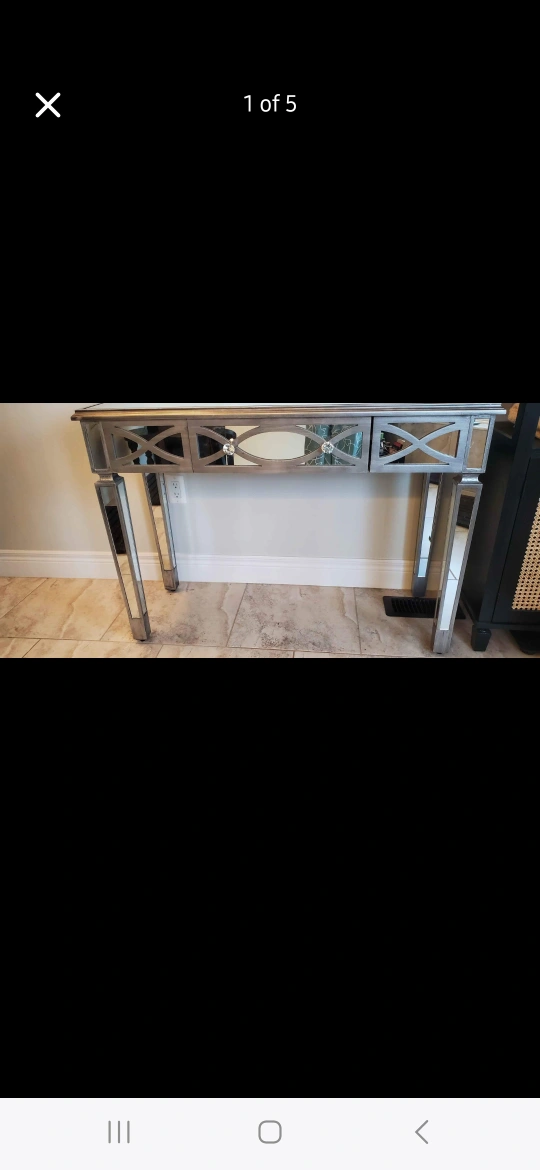 Elegant mirrored vanity table. Features two drawers with crystal knobs. Silver-toned frame. Perfect for bedroom or entryway.