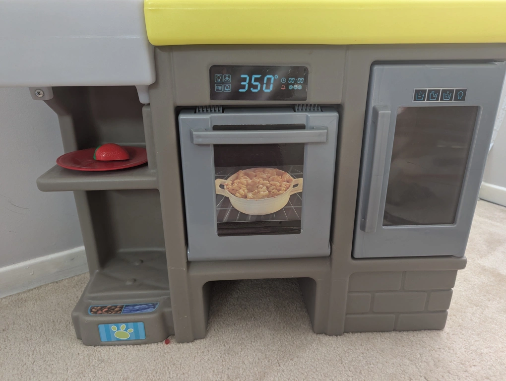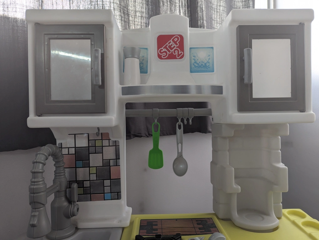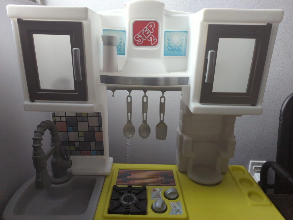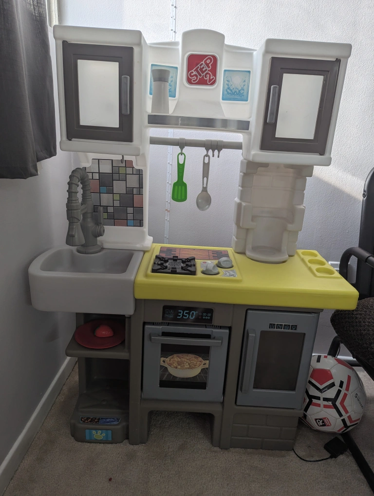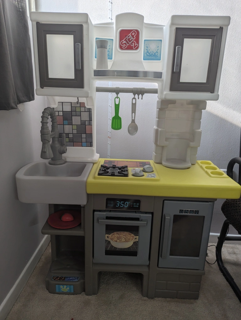 Play kitchen. Grey, white, and yellow. Features pretend oven, microwave, sink, and storage. Includes some accessories. Good condition.