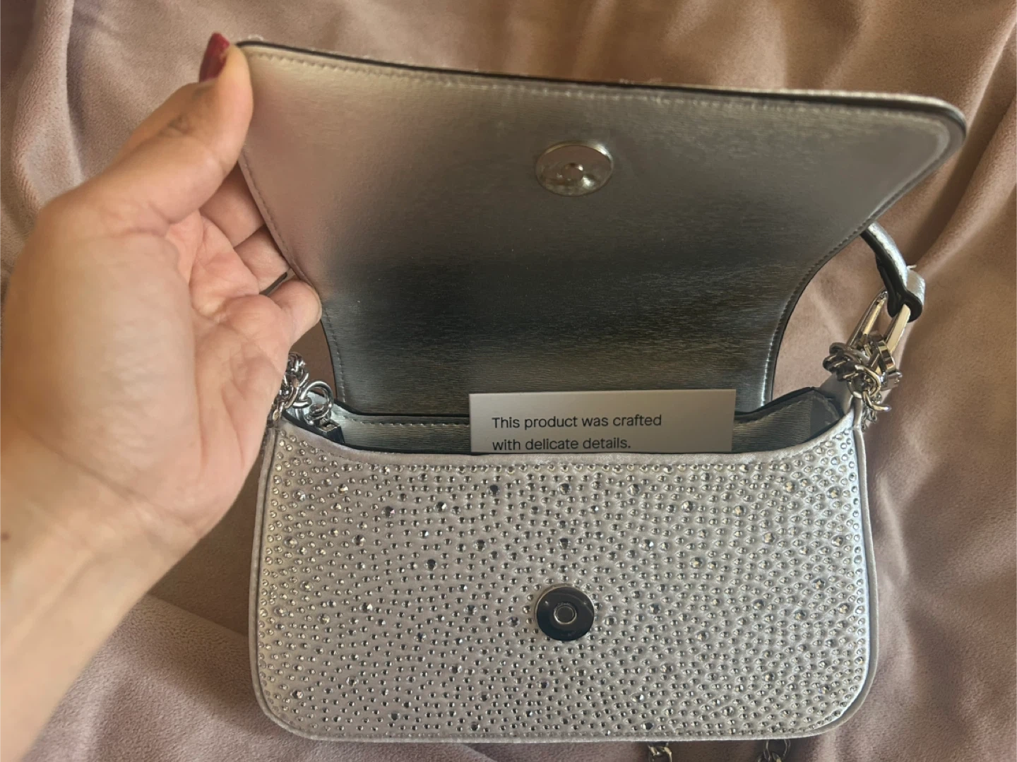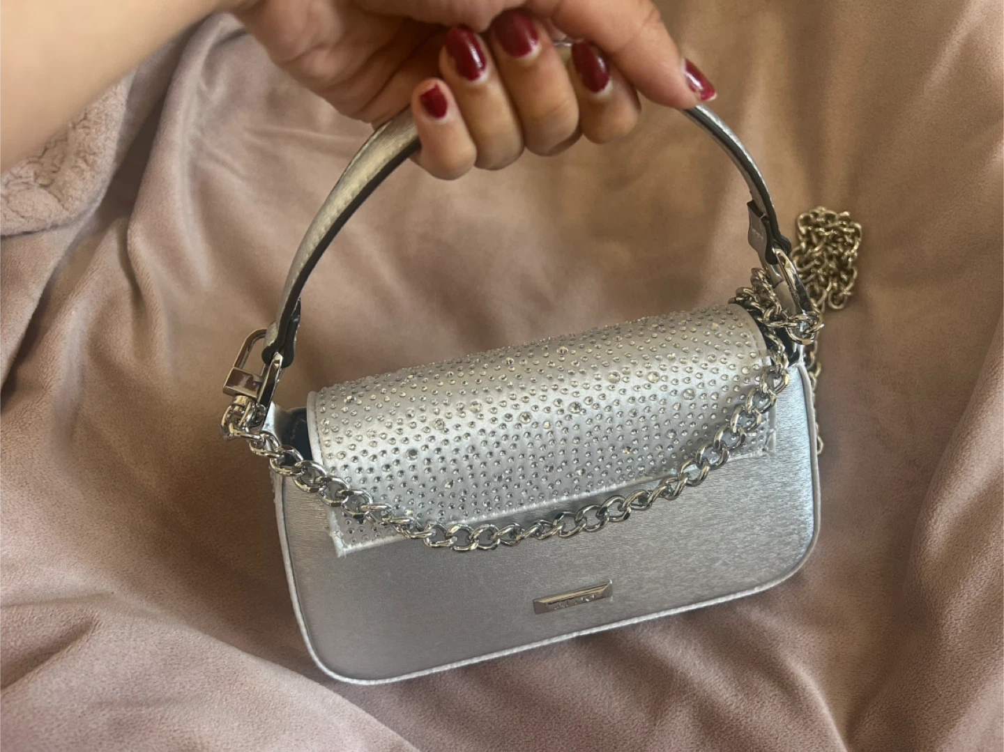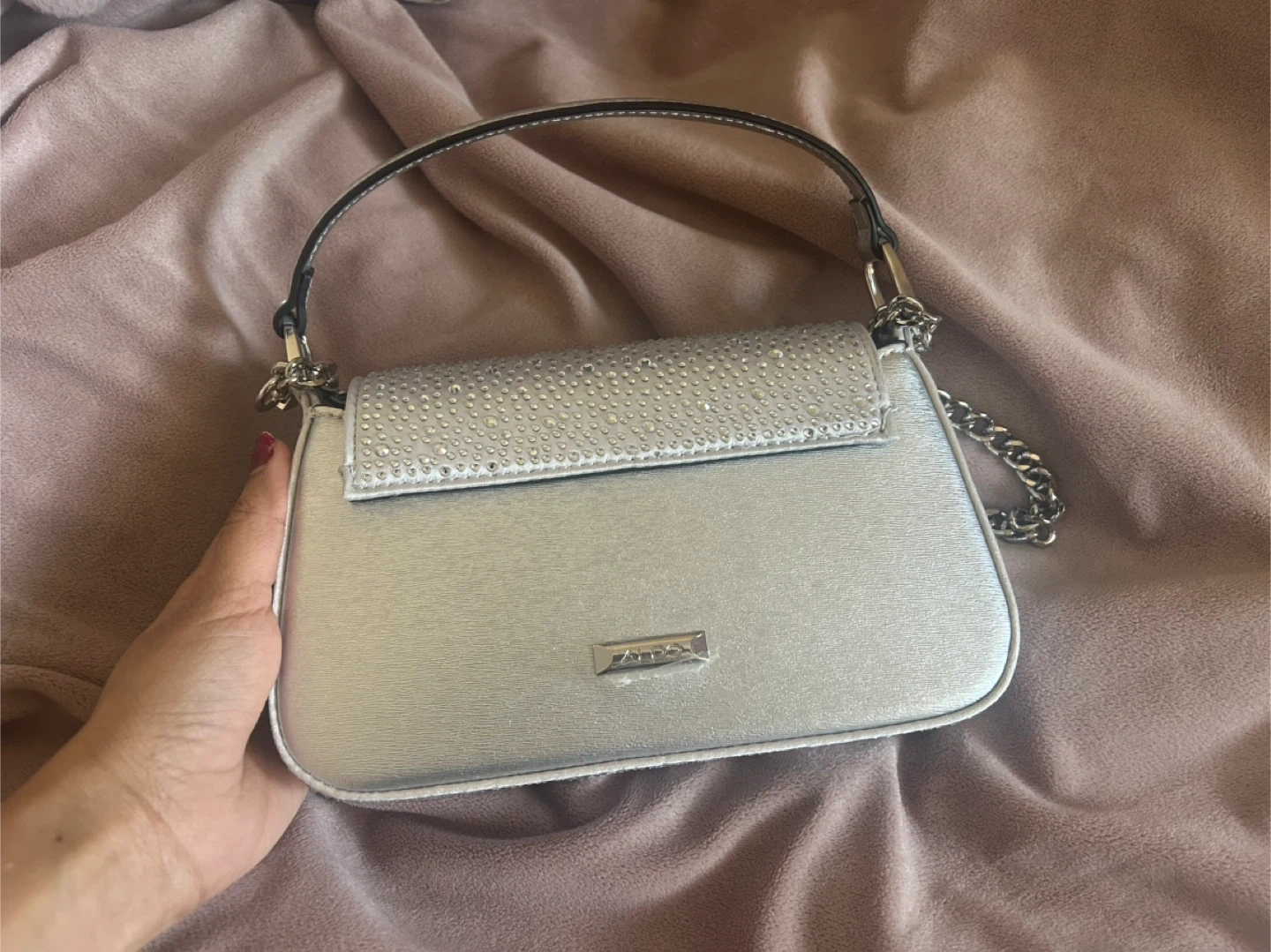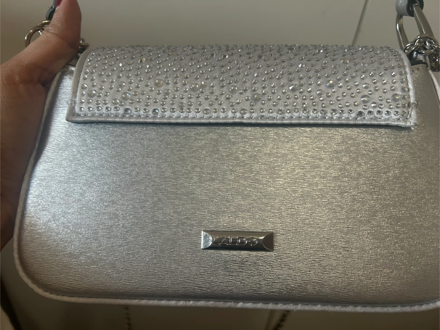 This is a sparkly silver shoulder bag from Aldo. It features a chain strap and is adorned with rhinestones on the flap. The interior has a card for delicate details.