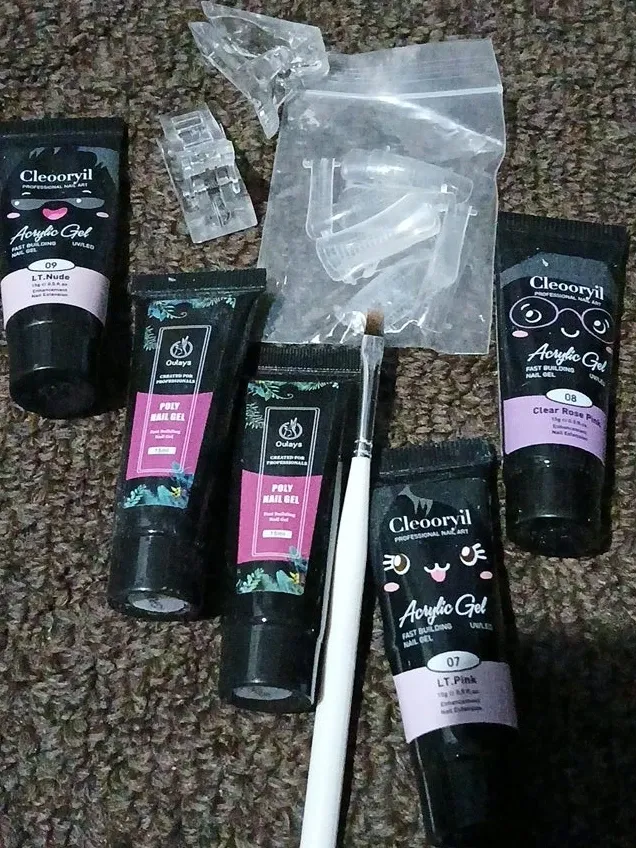 This kit includes Cleooryil acrylic gel in shades LT.Nude, LT.Pink, and Clear Rose Pink. It also contains Oulays poly nail gel and a nail art brush. Nail forms are included for application. Get salon-quality nails at home!