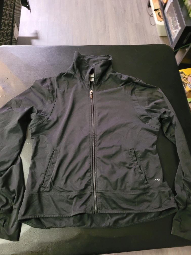 Women's size large black zip-up track jacket. Full zip closure. Two front pockets. Long sleeves. 100% polyester. Made in Jordan.