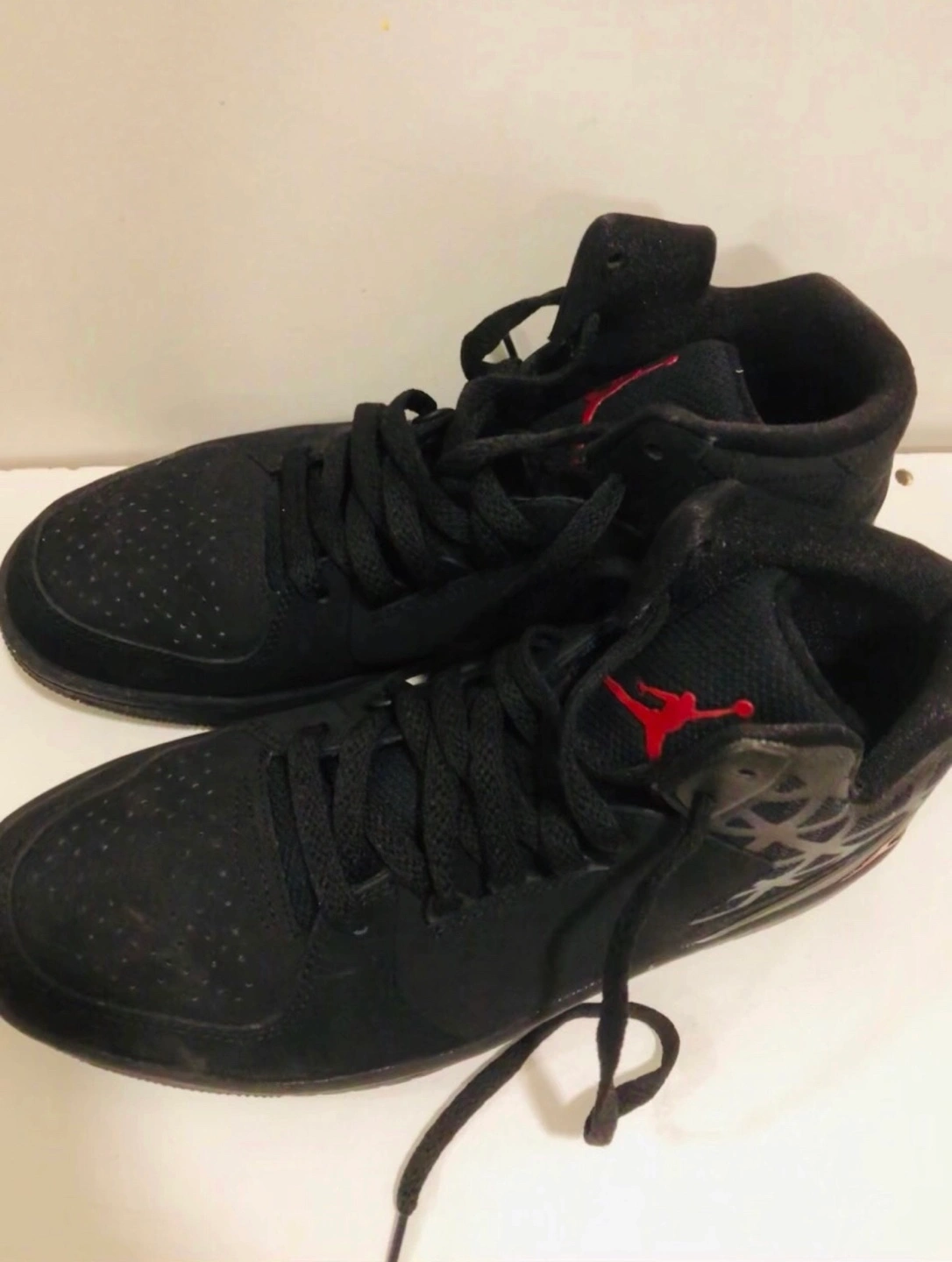 Pair of black high-top sneakers. Lace-up closure. Minimalist design. Red Jumpman logo detail. Jordan 1 flight 3 never worn