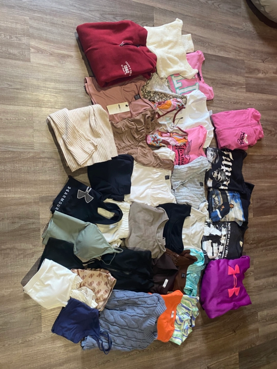 Large bundle of women's clothing. Includes tops, shirts, sweaters, and bottoms. Various colours and patterns. Sizes medium . Good condition.