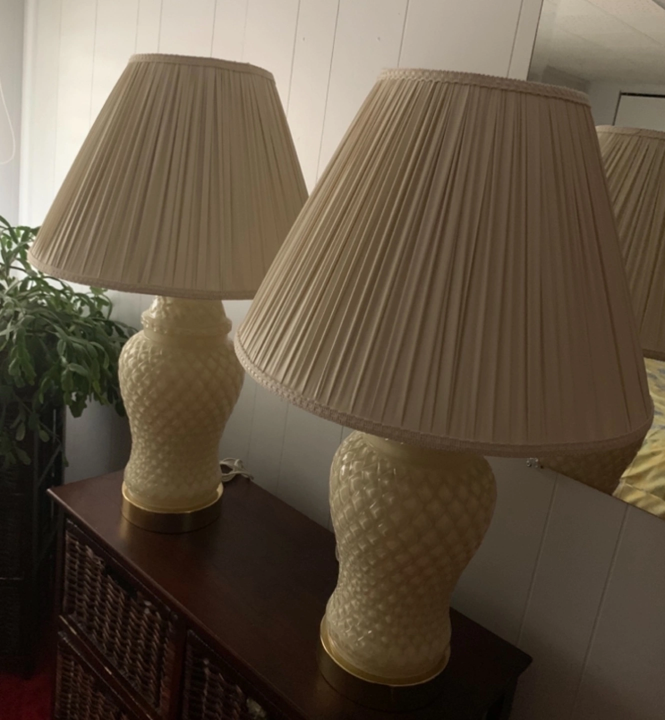 Set of two lovely table lamps. Cream-coloured pleated shades. Unique textured bases. Gold-coloured accents. Perfect for a living room or bedroom. $15 for both