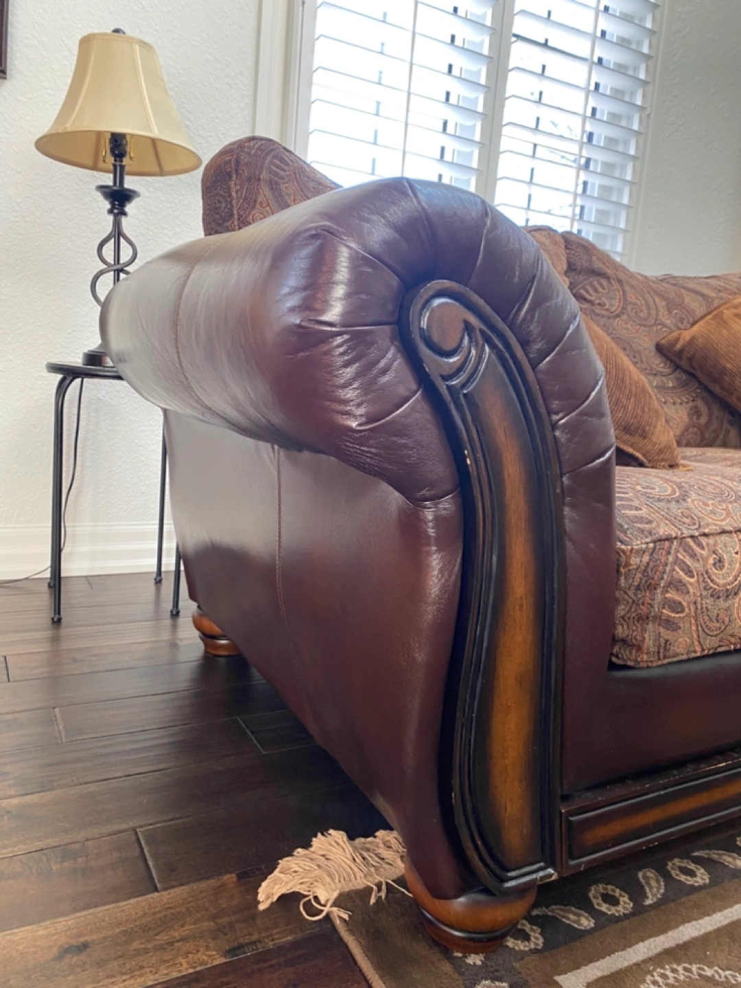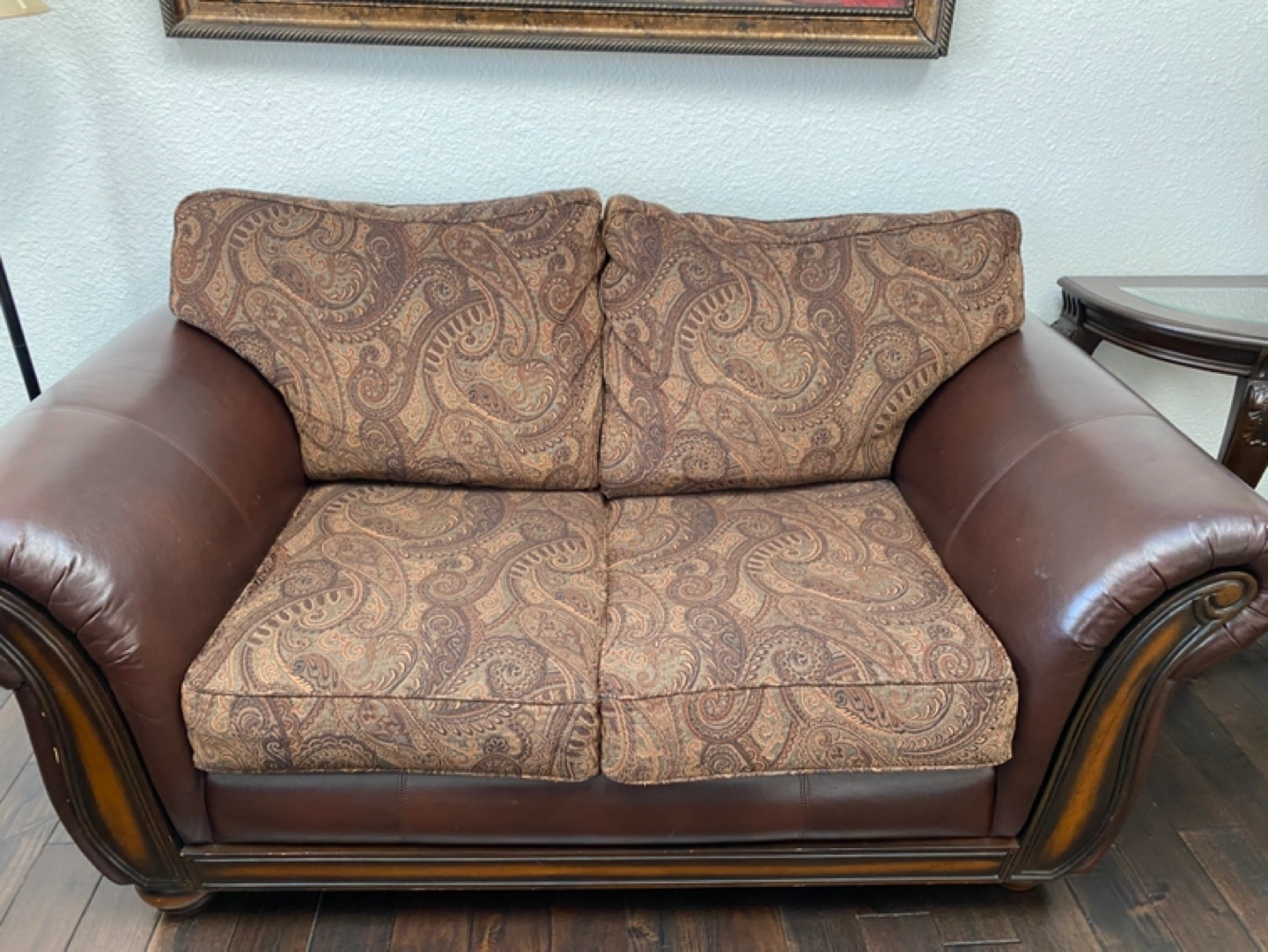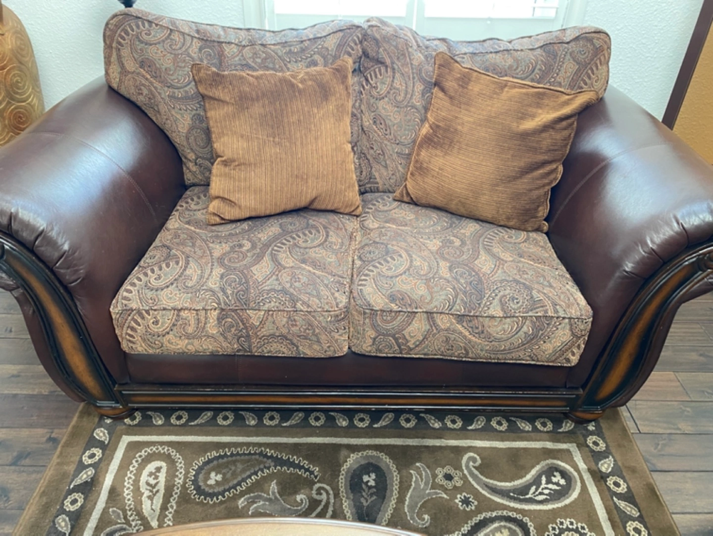 Beautiful loveseat, brown leather arms and sides. Paisley patterned fabric cushions. Two coordinating throw pillows included. Wood trim accents. Elegant and comfortable.