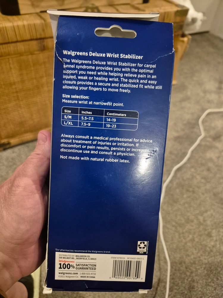 New Walgreens Deluxe Wrist Stabilizer. Size Large/Extra Large. Provides optimal support for carpal tunnel syndrome. Antimicrobial. Helps relieve pain. Adjustable. For day or night use.