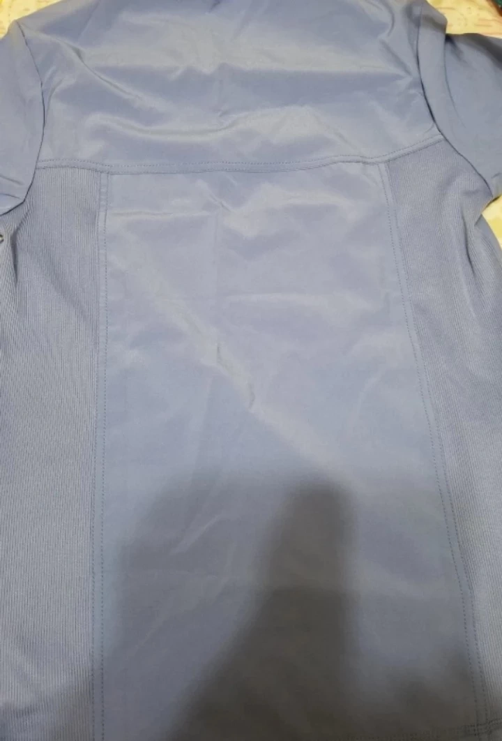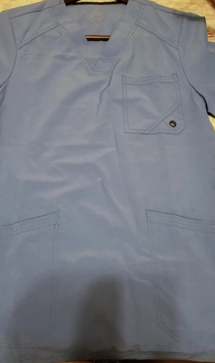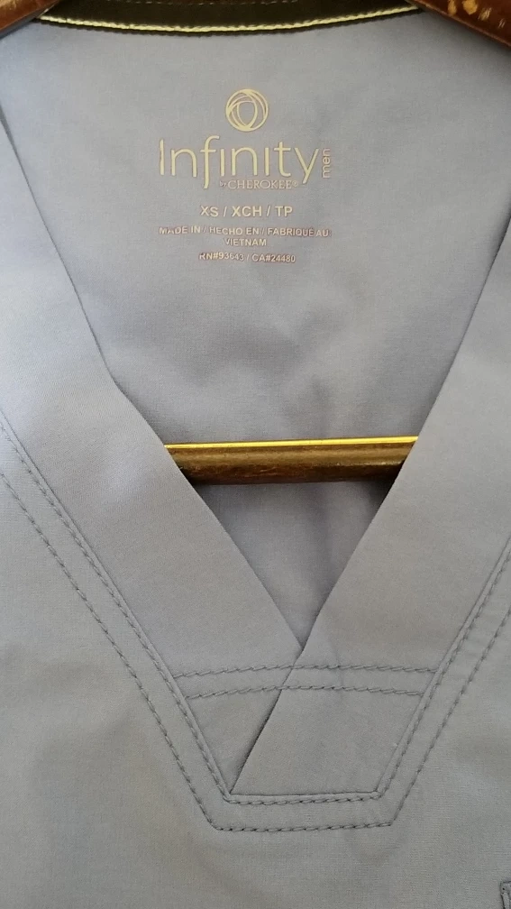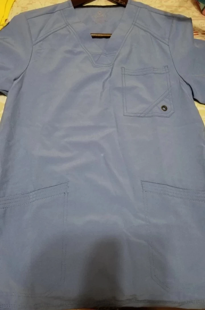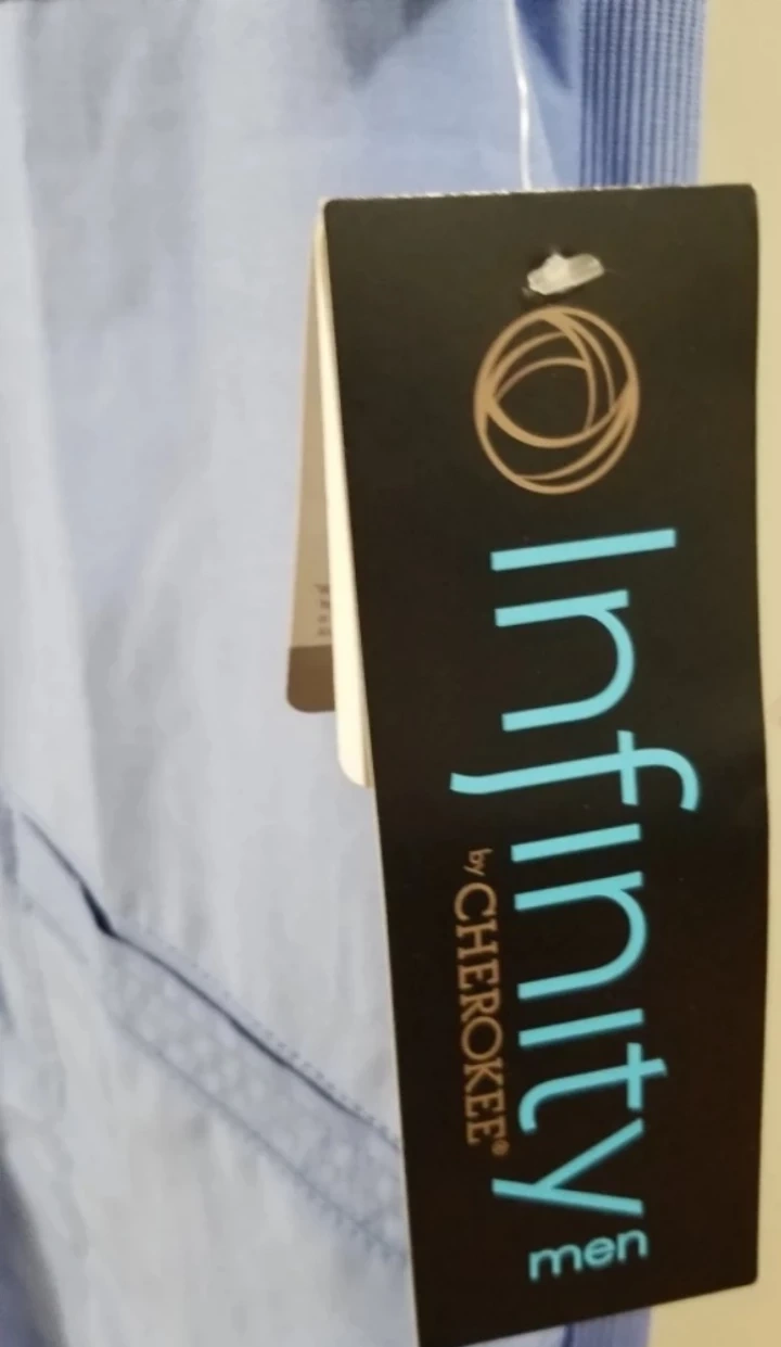 Men's size scrub top. Periwinkle blue. Short sleeves. V-neck. Two lower pockets. One chest pocket. Brand new with tags. Cherokee Infinity by Certainty technology.