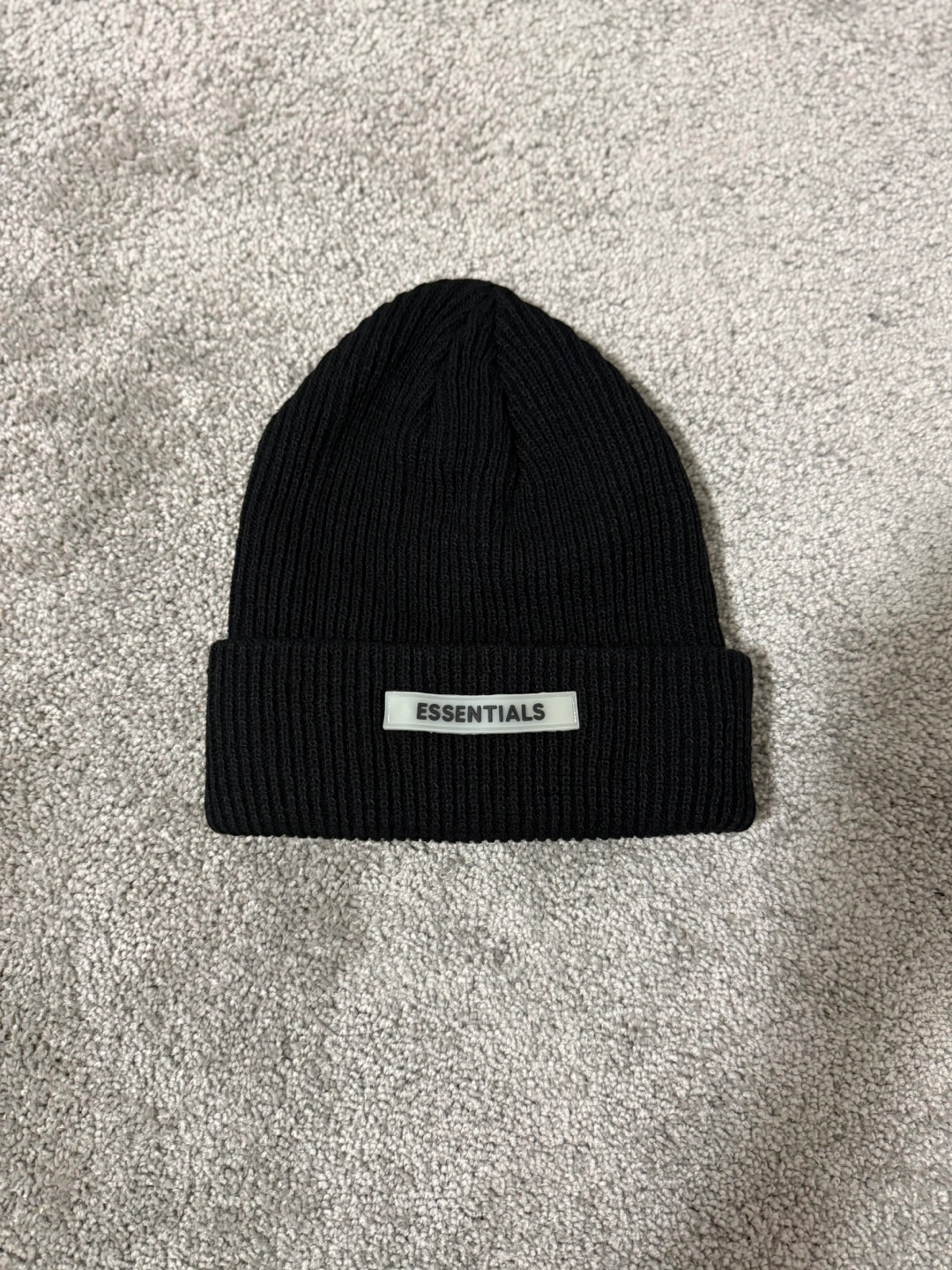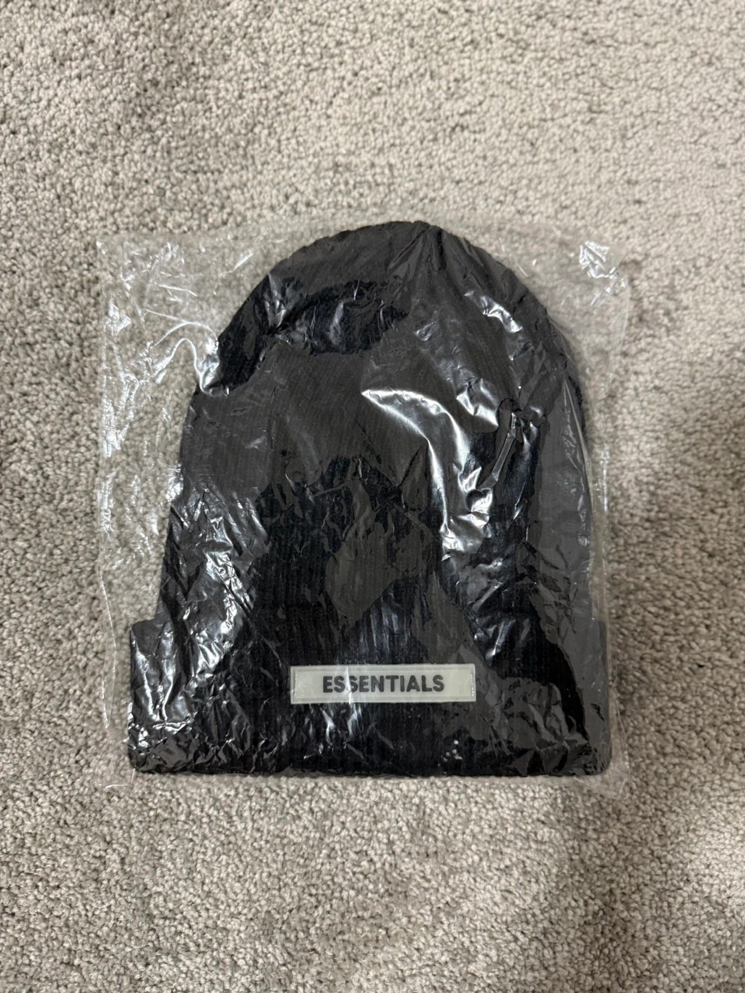 Brand new, black knit beanie. Features a small Essentials logo tag. Never worn, still in
