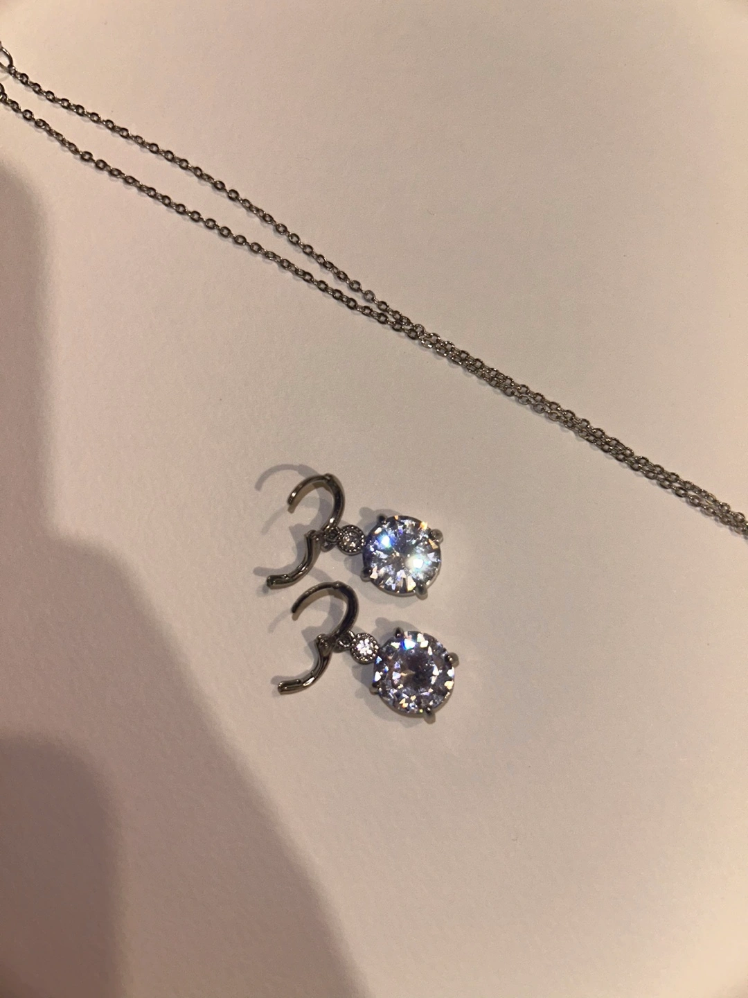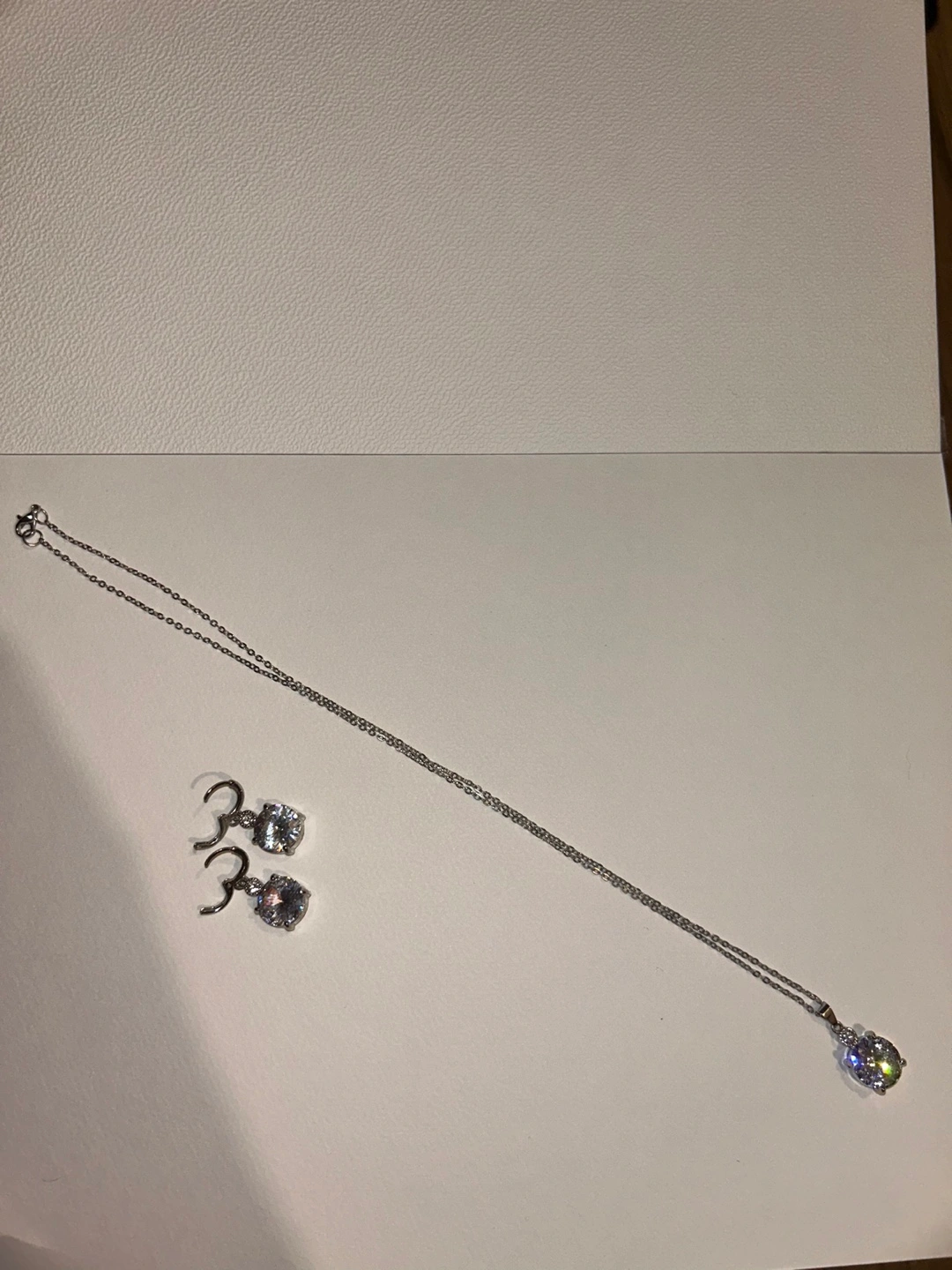 Stunning silver-toned necklace and earring set. Features large, sparkly cubic zirconia stones. Perfect for an evening out or special occasion. Silver chain and delicate drop earrings.
