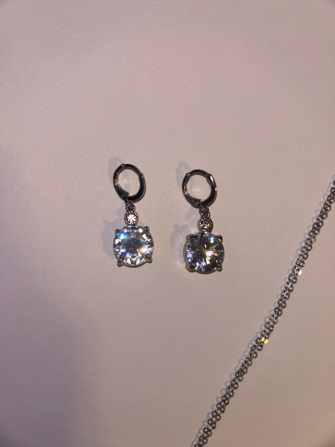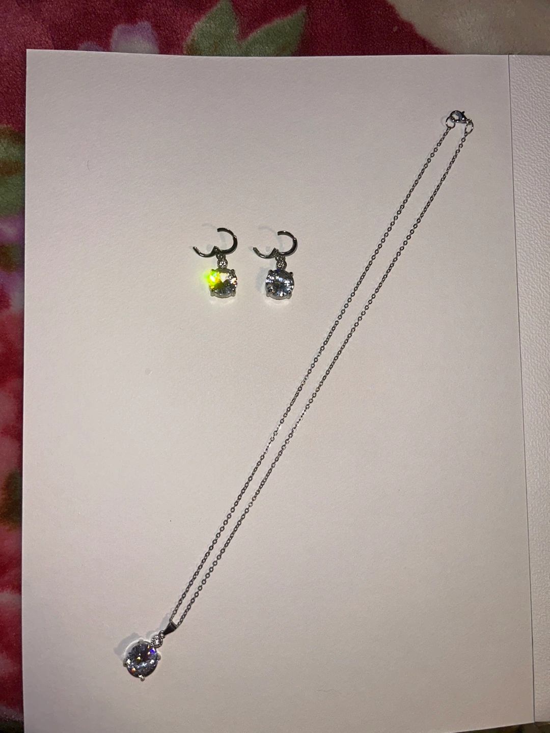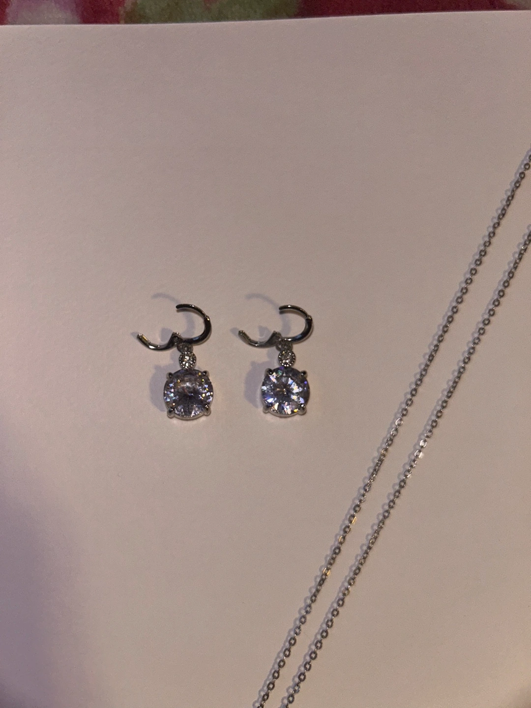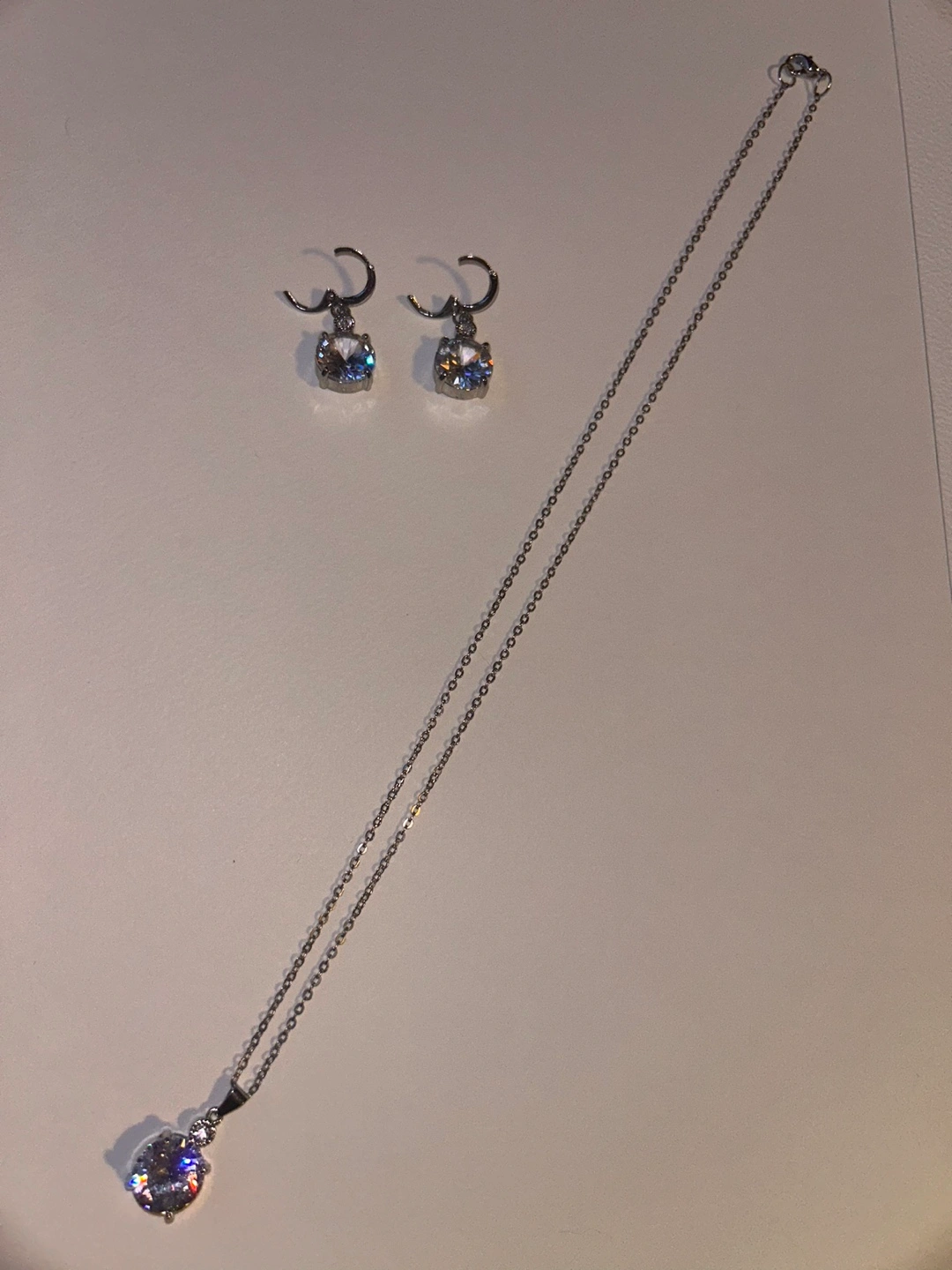 Stunning silver-toned necklace and earring set. Features large, sparkly cubic zirconia stones. Perfect for an evening out or special occasion. Silver chain and delicate drop earrings.