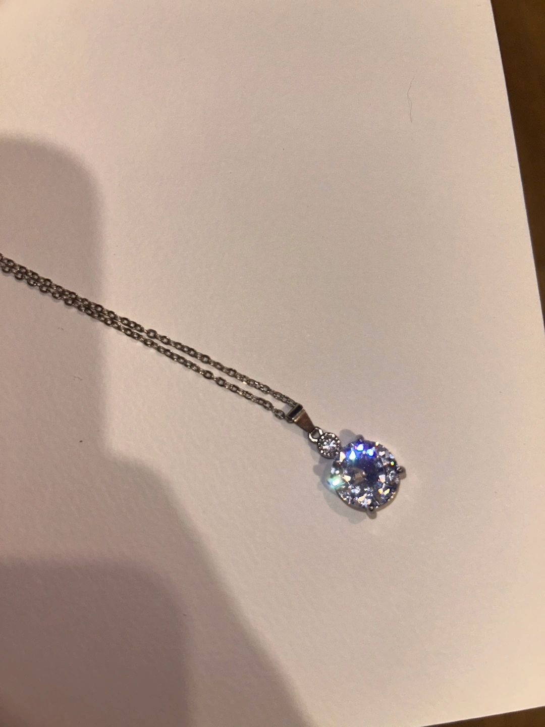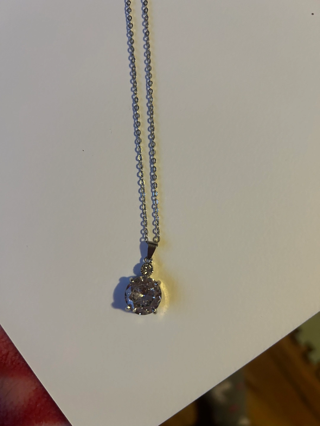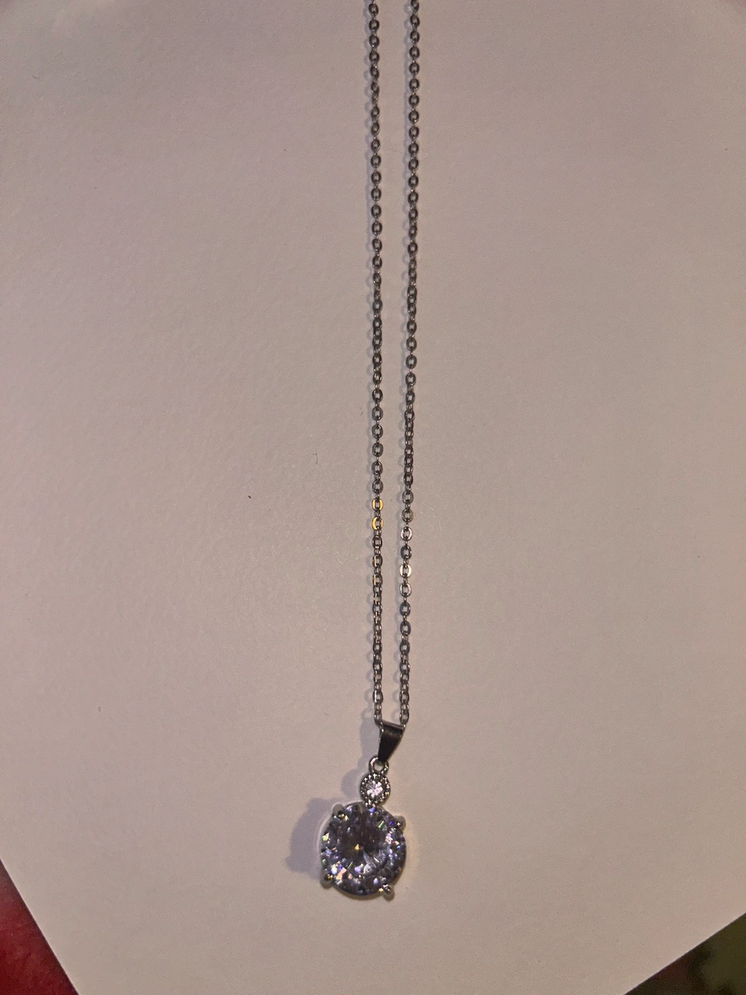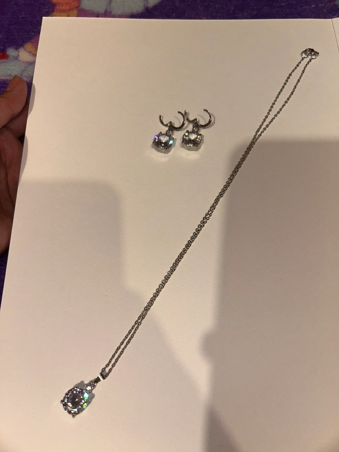 Stunning silver-toned necklace and earring set. Features large, sparkly cubic zirconia stones. Perfect for an evening out or special occasion. Silver chain and delicate drop earrings.
