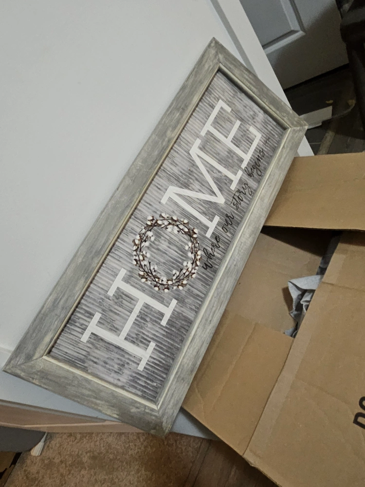 Grey wood framed wall sign. Features the word HOME in white lettering with a floral wreath design. Includes the phrase "Where our story begins". Perfect for entryway or living room.