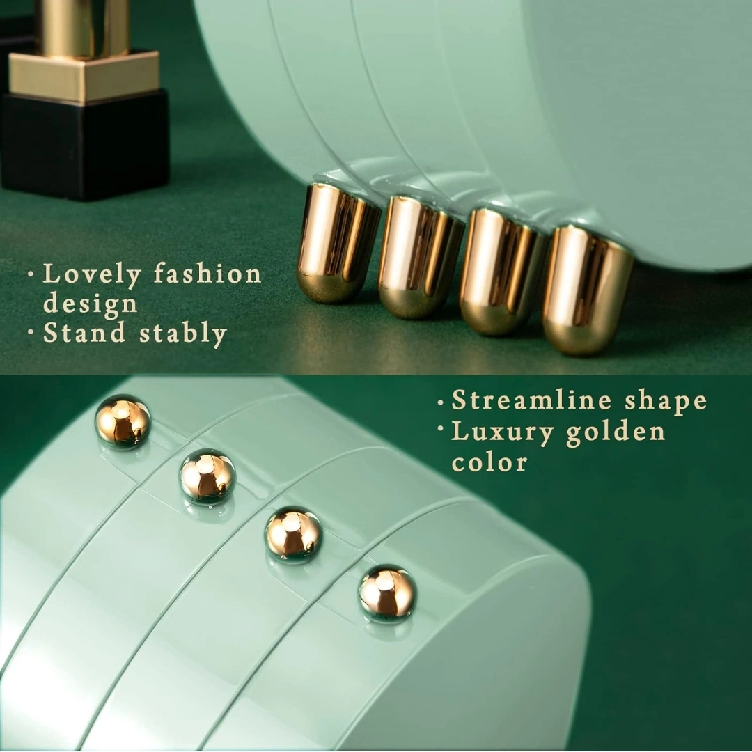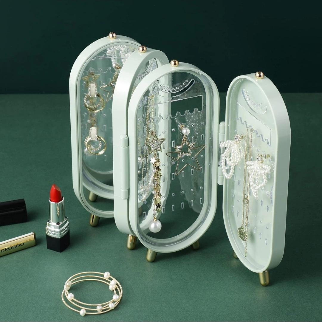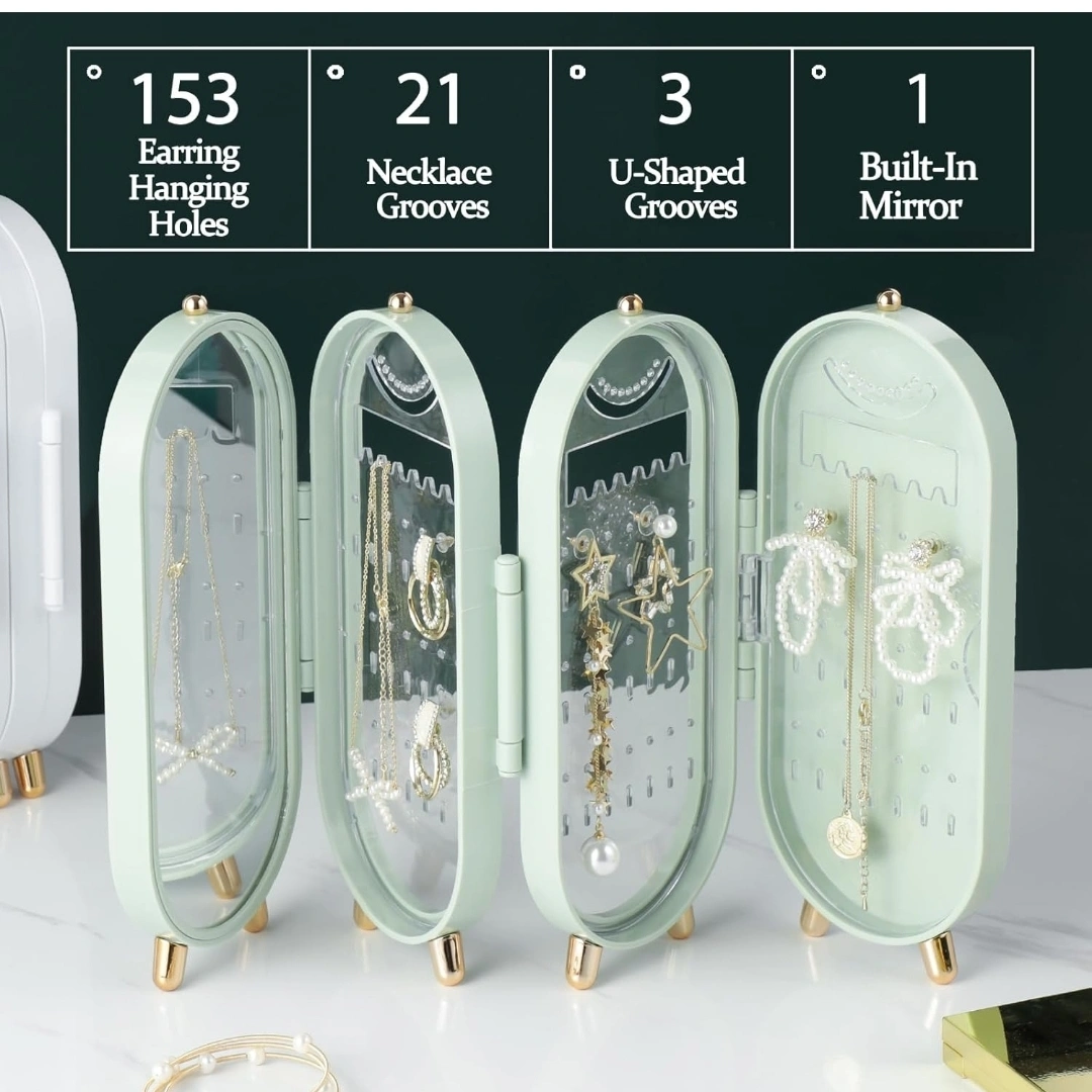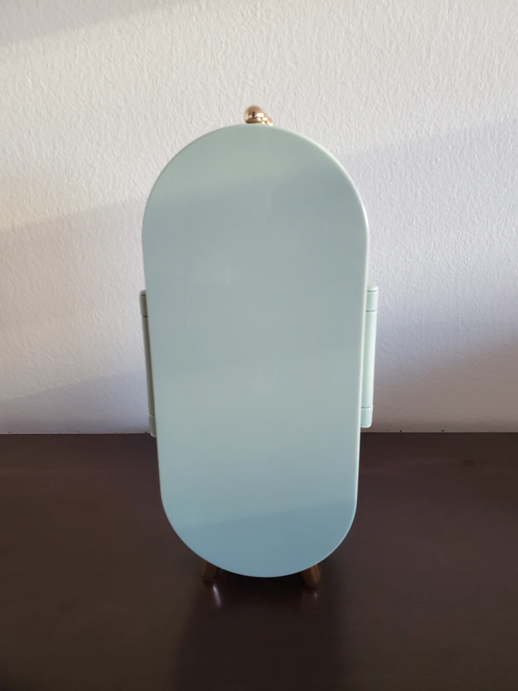 214Stylish mint green jewelry armoire. Features earring slots, necklace grooves, and a built-in mirror. Stands stably on four small gold feet. Perfect for travel or home use.