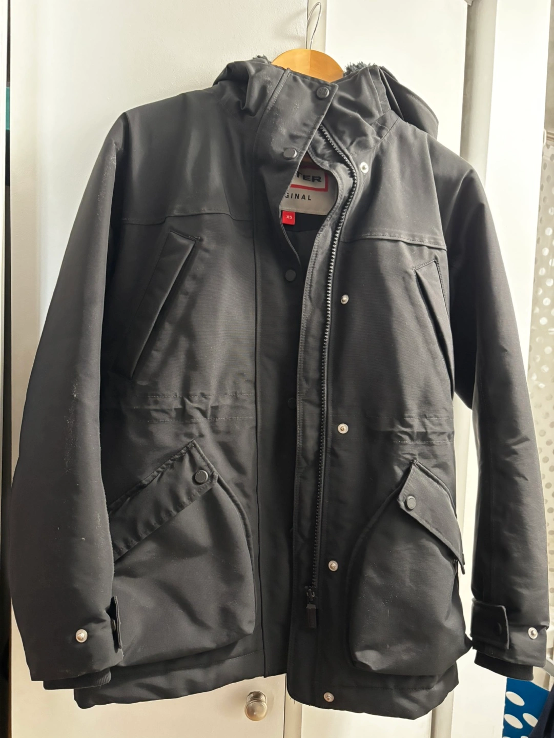 Unisex winter jacket. Size extra small. Features a hood and zip closure. Good condition. Super warm