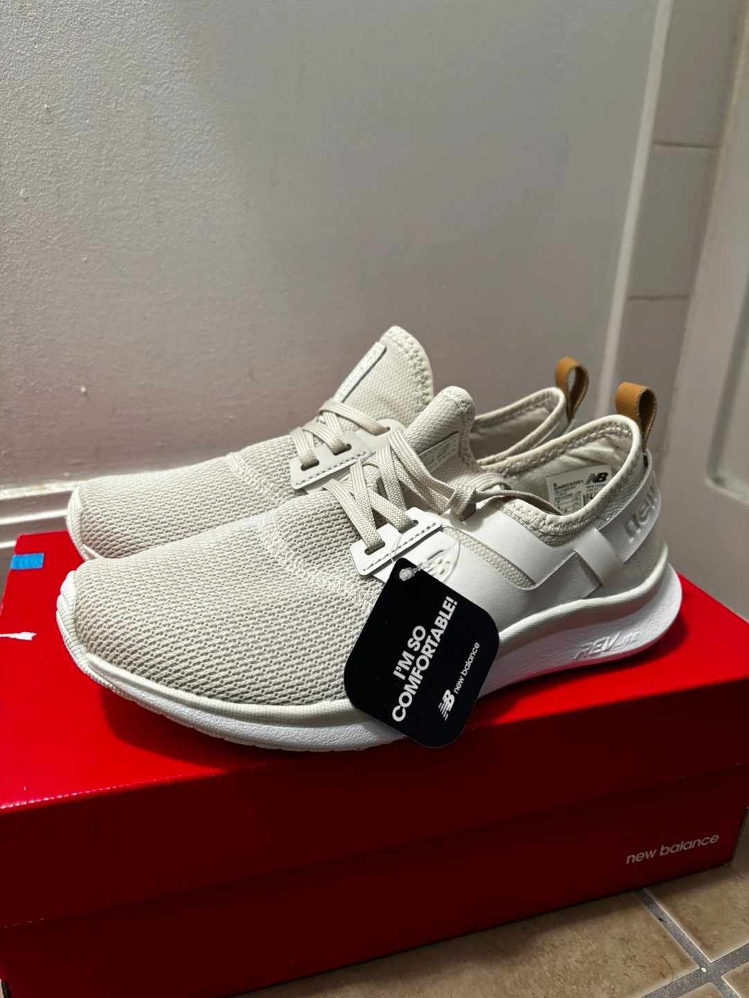 Beige knit upper. White sole. Tan leather accents. Memory foam insole. Comfortable and stylish.