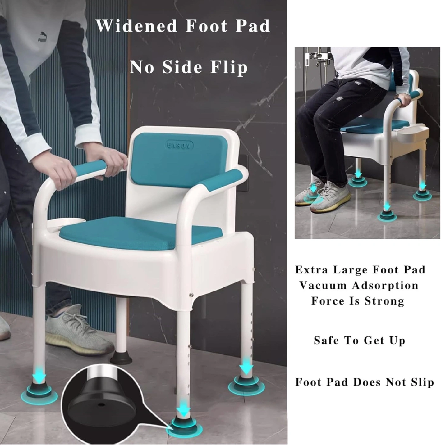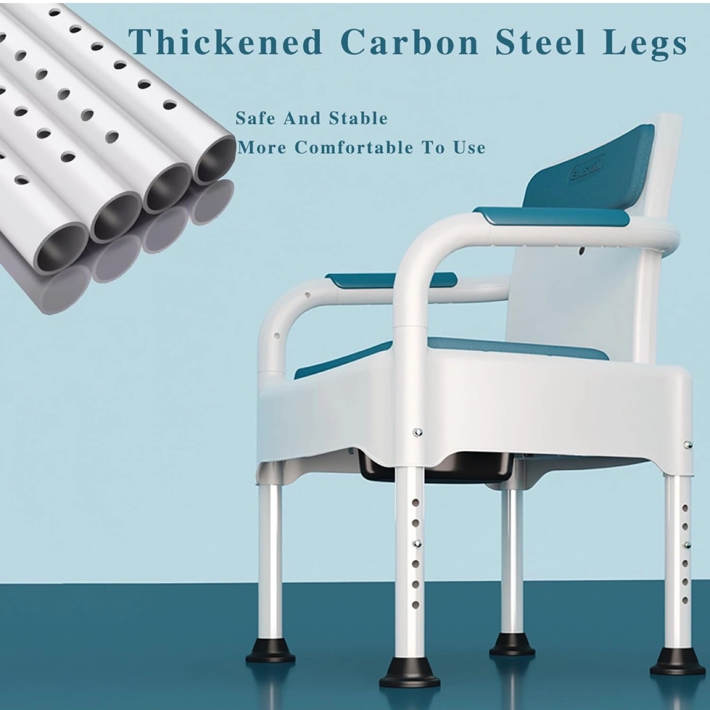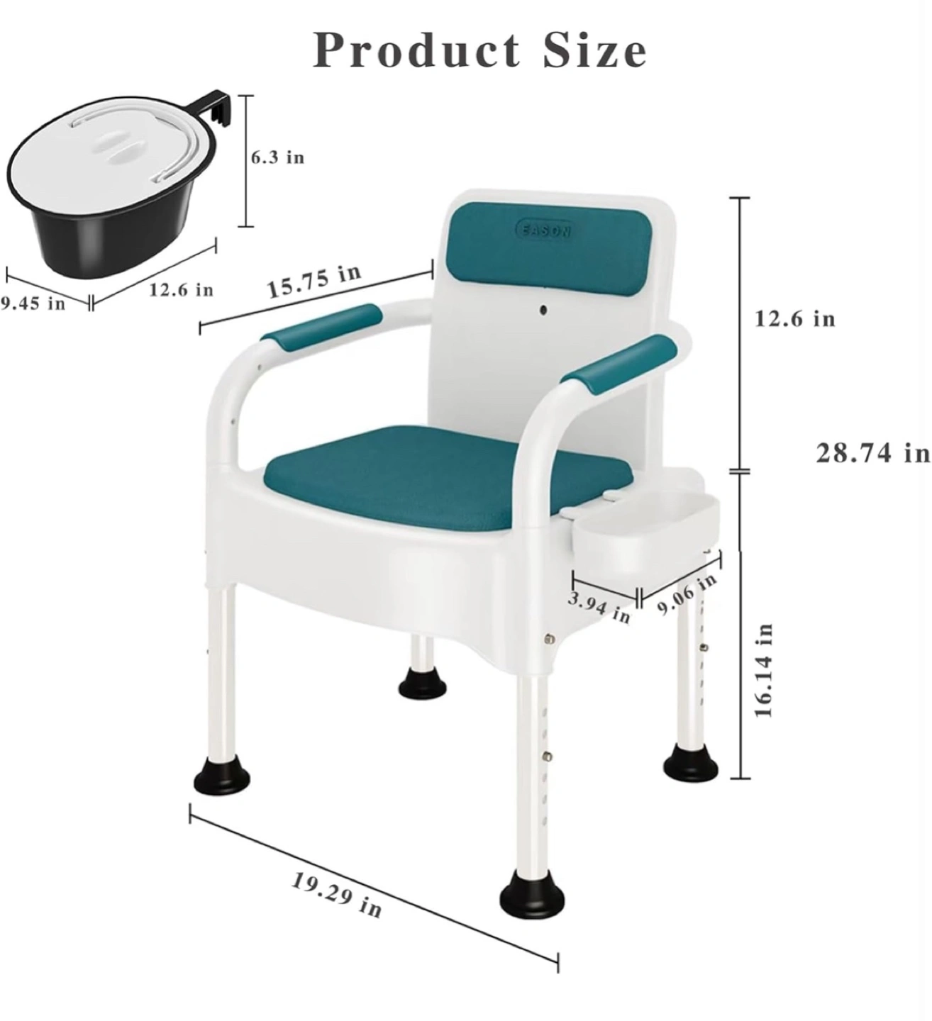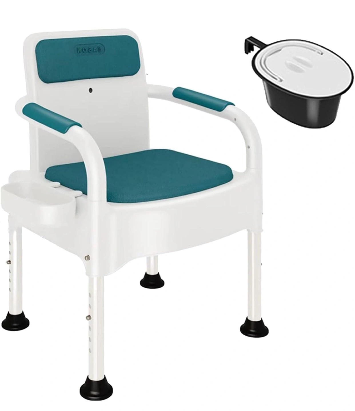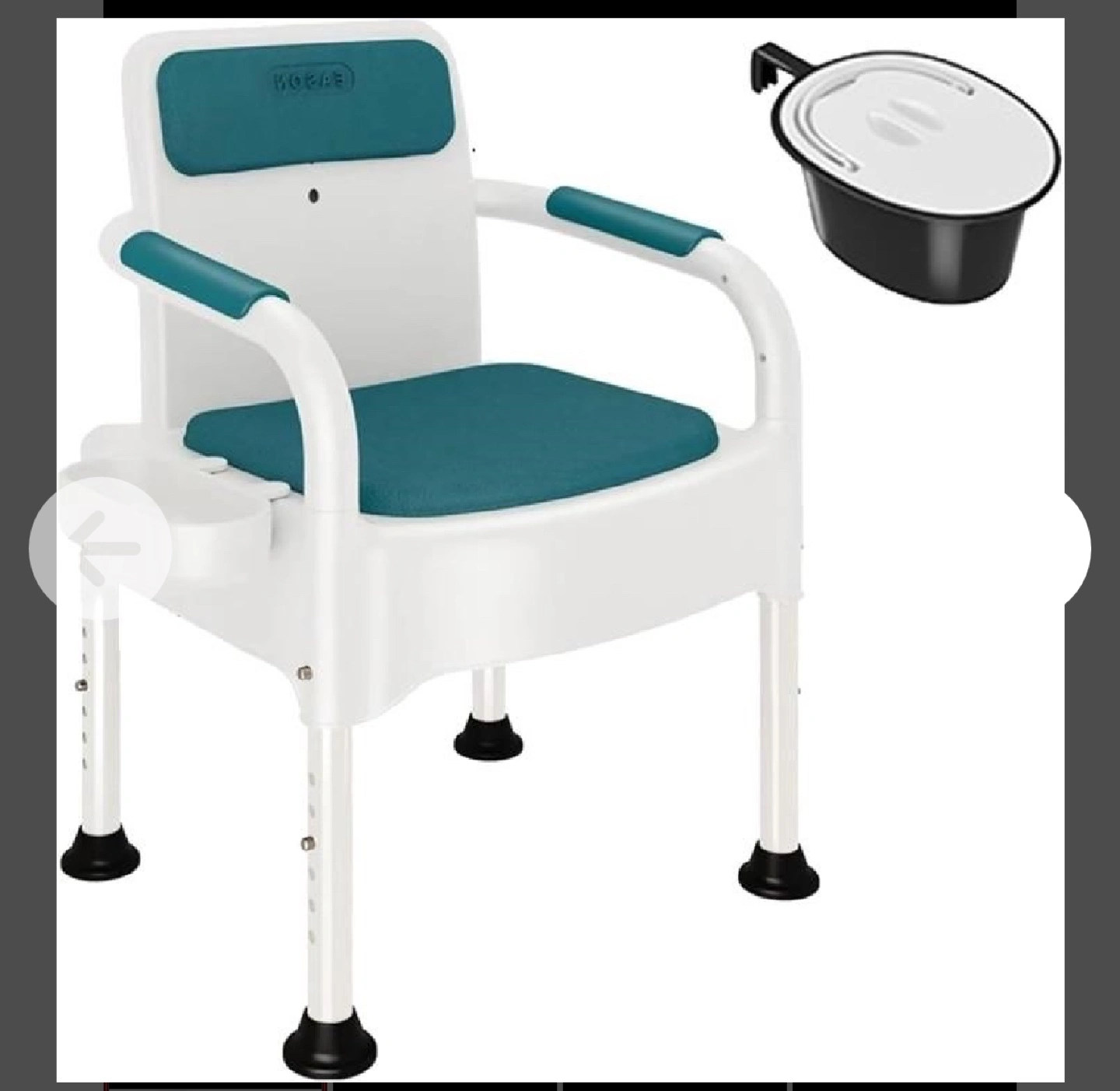 106Comfortable, sturdy toilet chair. Features armrests and a padded seat. Includes a removable commode pail. Ideal for seniors or those with mobility issues. Easy to clean.