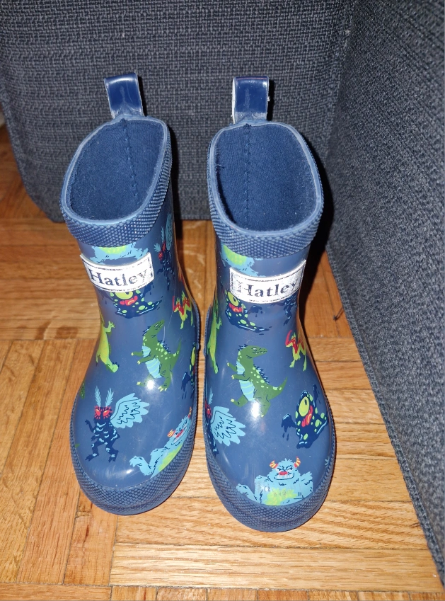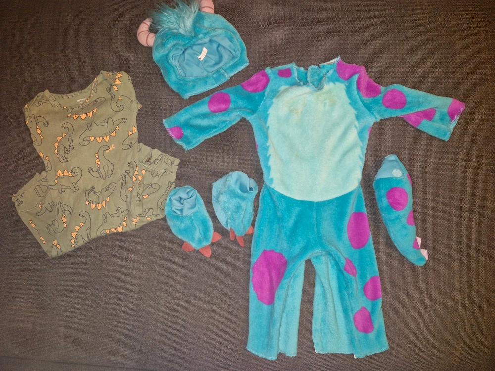 Adorable Monsters Inc Sulley costume, includes jumpsuit and booties. Matching dinosaur pajamas included. Pair of Hatley brand rainboots. Pre-loved, but in good condition. Perfect for Halloween or imaginative play.