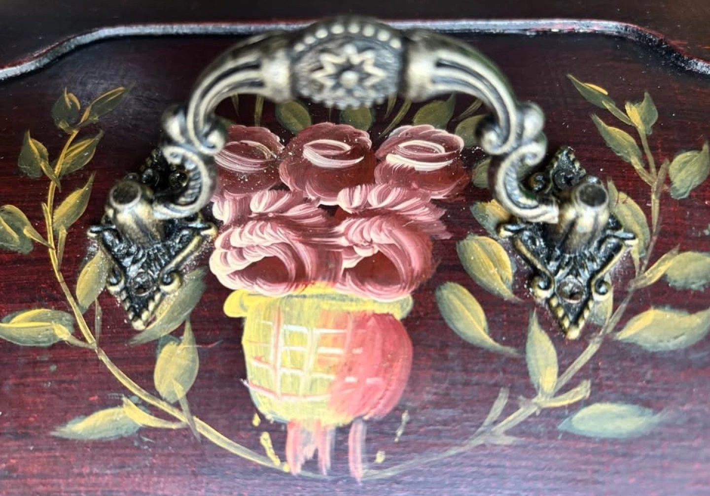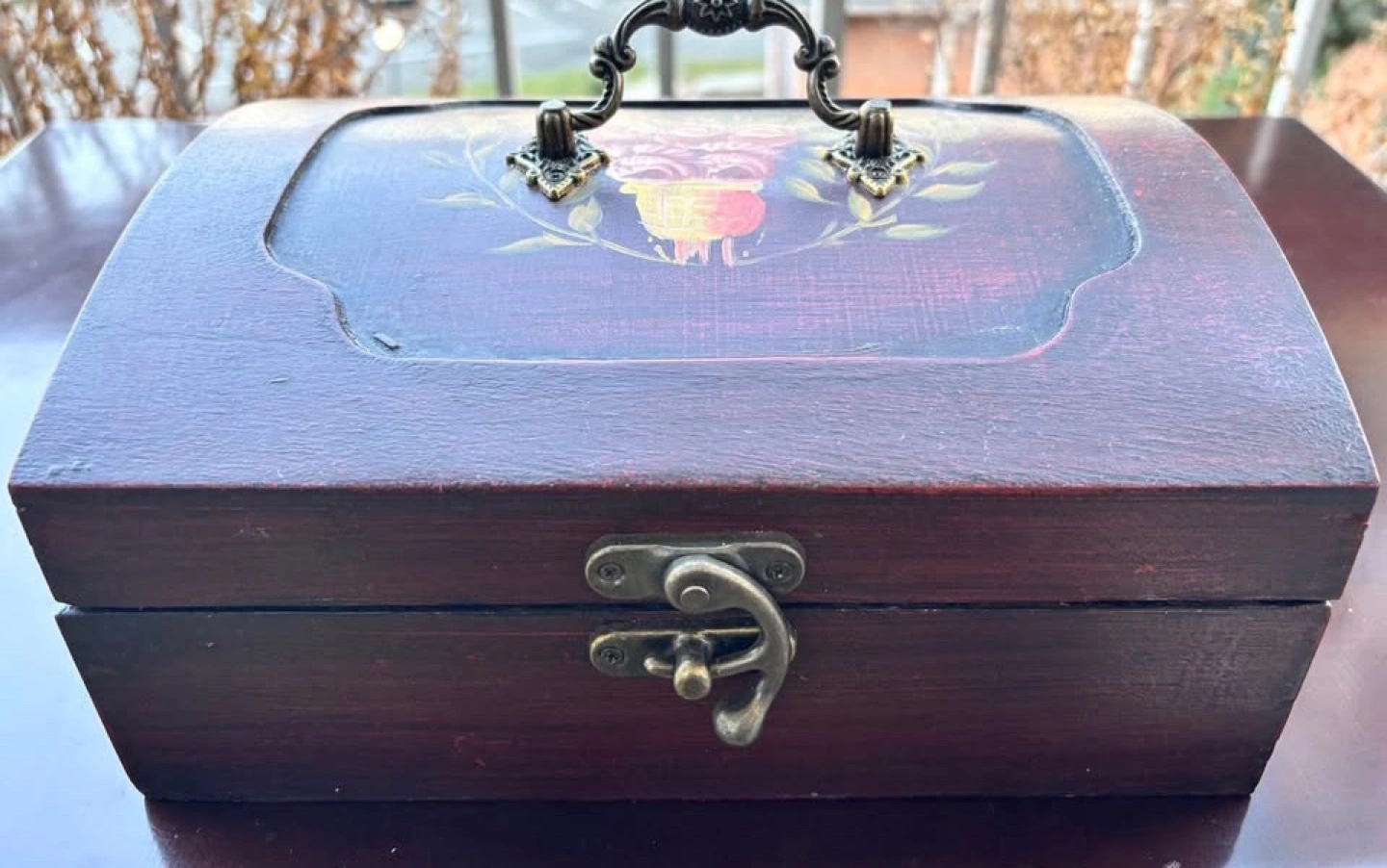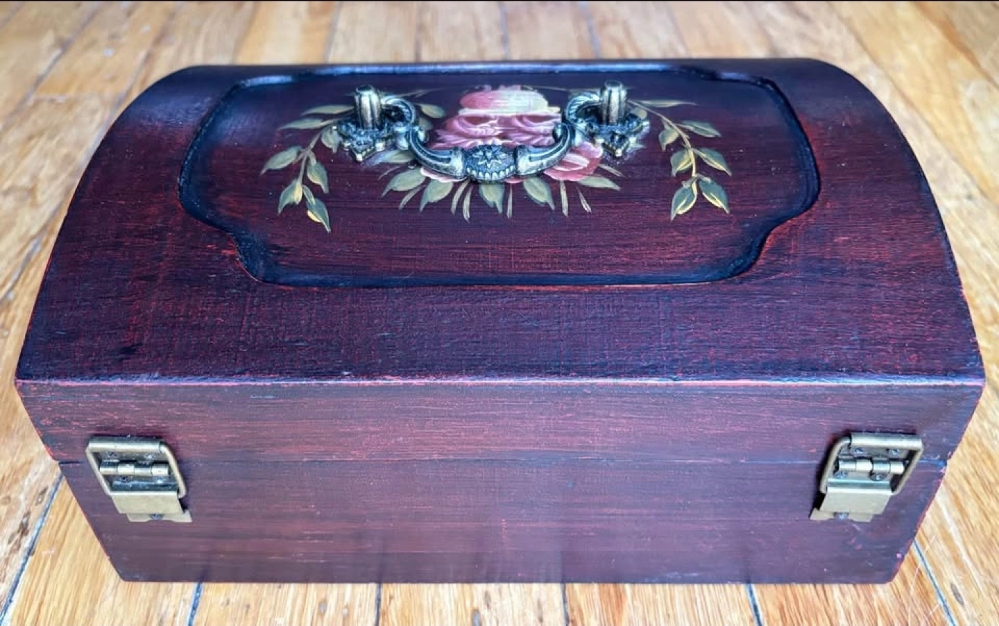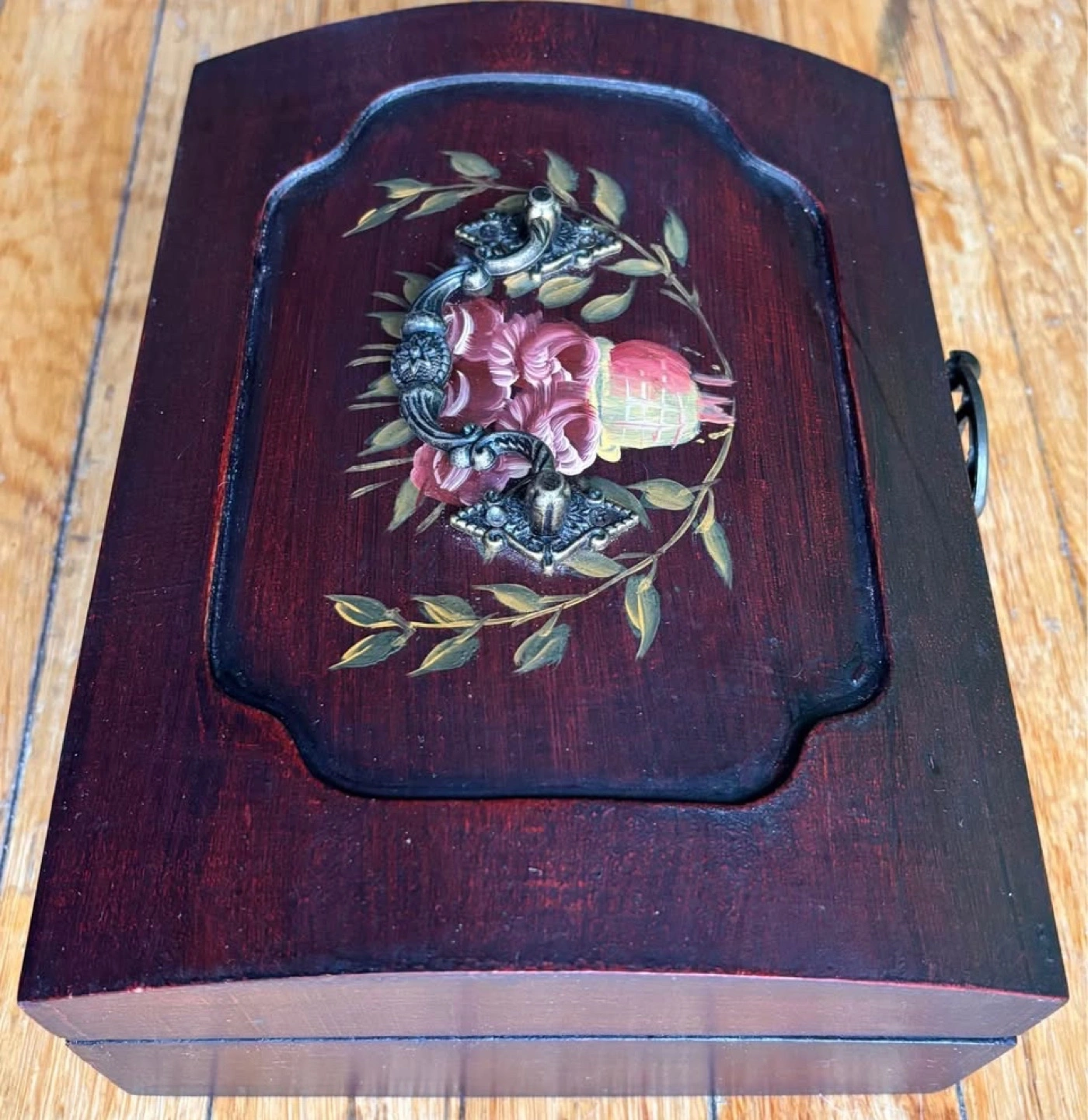 Vintage Wood Tea Caddy with Hand-painted Floral Motif and Ornate Brass Hardware