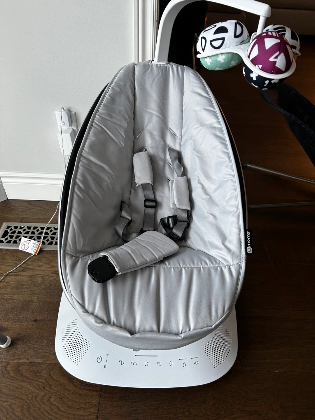 Grey fabric baby swing. Features a built-in sound system and mobile.