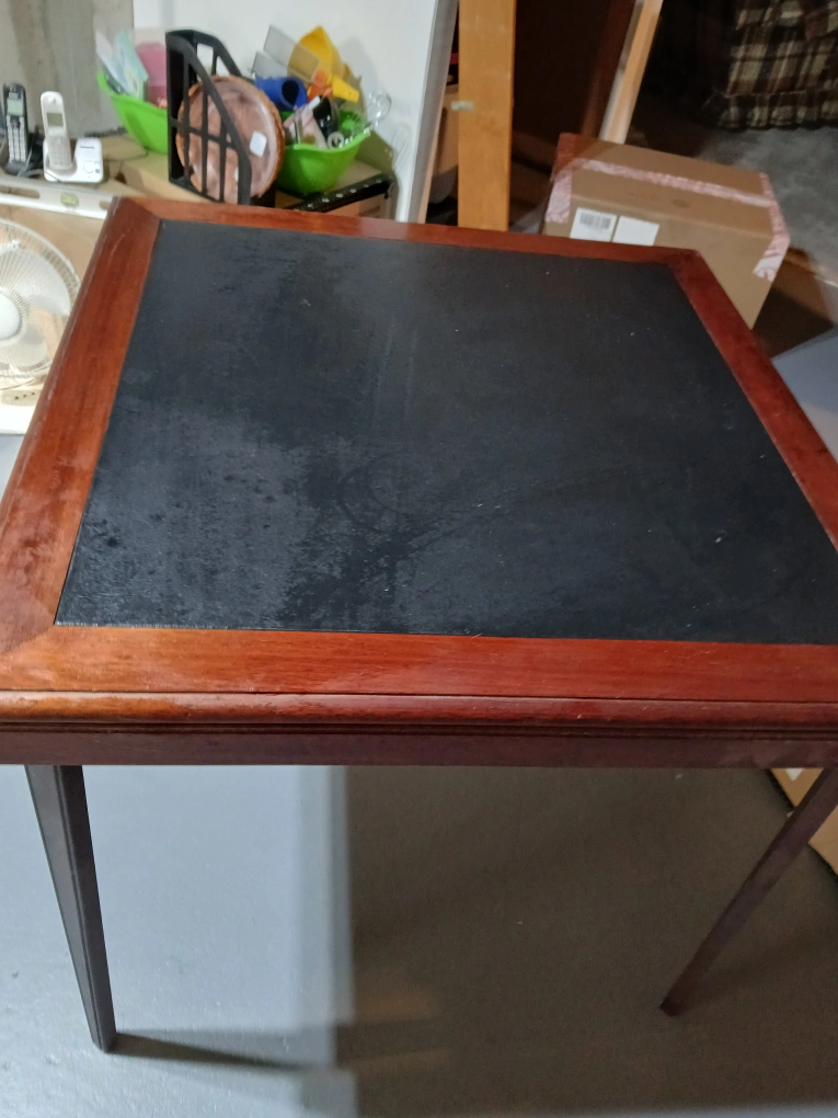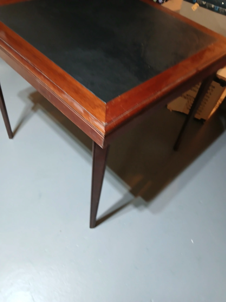 Foldable game table. Dark wood frame. Black playing surface. Shows some wear. in good shape . no tears or rips in leather inset. legs fold down and in