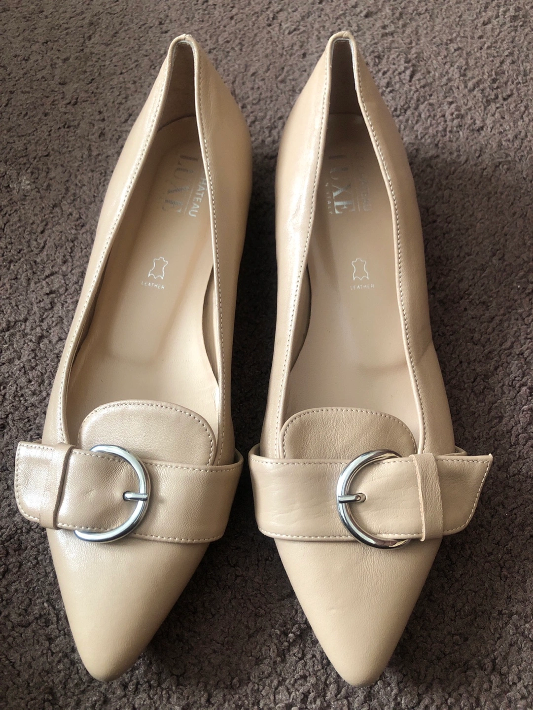 Pair of beige leather ballerina flats. Pointed toe. Silver buckle detail. Made in Italy. Size 38.